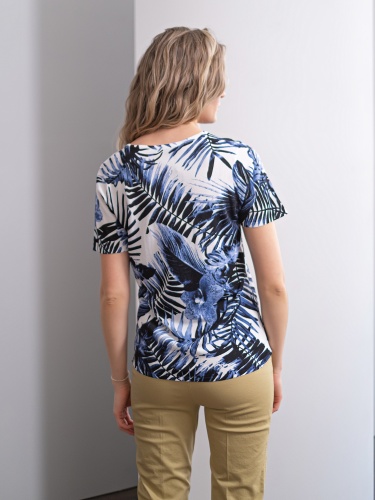 Прямой покрой джемпера скроет недостатки фигуры. Круглый вырез горловины создаст женственный образ. Модный в новом сезоне принт с тропическим мотивом подчеркнет чувство вкуса обладательницы джемпера. Данная модель будет удачно сочетаться как с брюками, так и с юбкой.