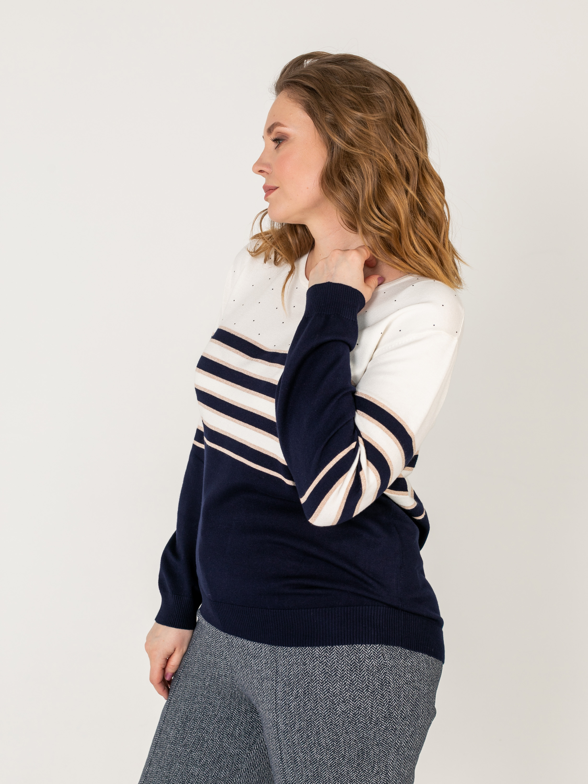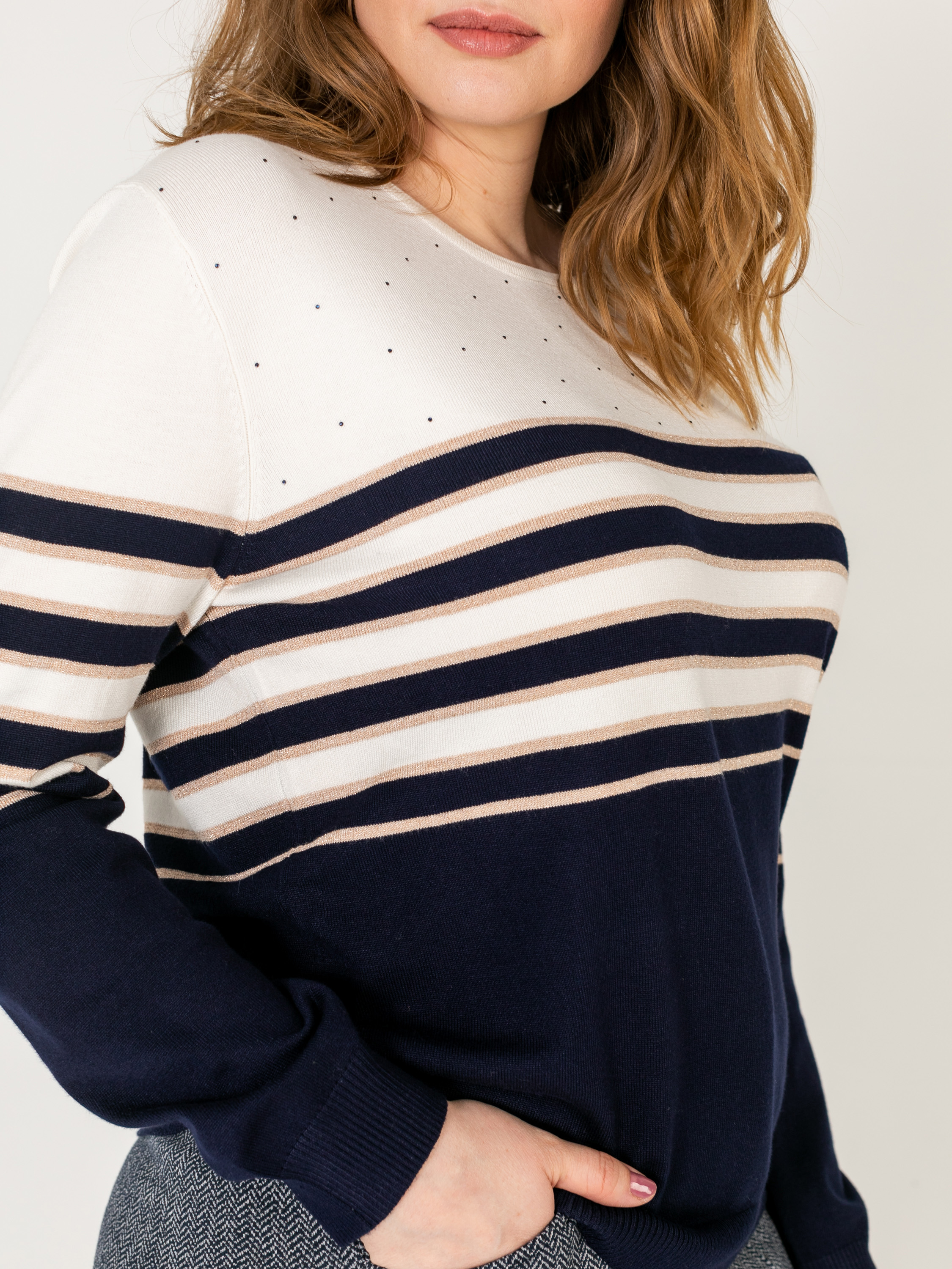 На сайте указаны российские размеры. Ткань: 60% вискоза, 35% нейлон, 5% люрекс. Крой: базовая модель джемпера прямого силуэта средней длины. Модель с удлиненными рукавами и круглым воротом – классика, которую выбирают миллионы женщин. Джемпер подчеркивает все достоинства, в его составе мягкая вискоза, которая приятна и комфортна в носке. Отделка: обаяние этого джемпера заключается в россыпи скромных страз, которыми украсили верхнюю часть изделия. Издалека они напоминают маленькие точки, но при свете они дают легкое сияние, которое улучшает настроение. Сочетайте с джинсами, брюками смежных оттенков и цветов.