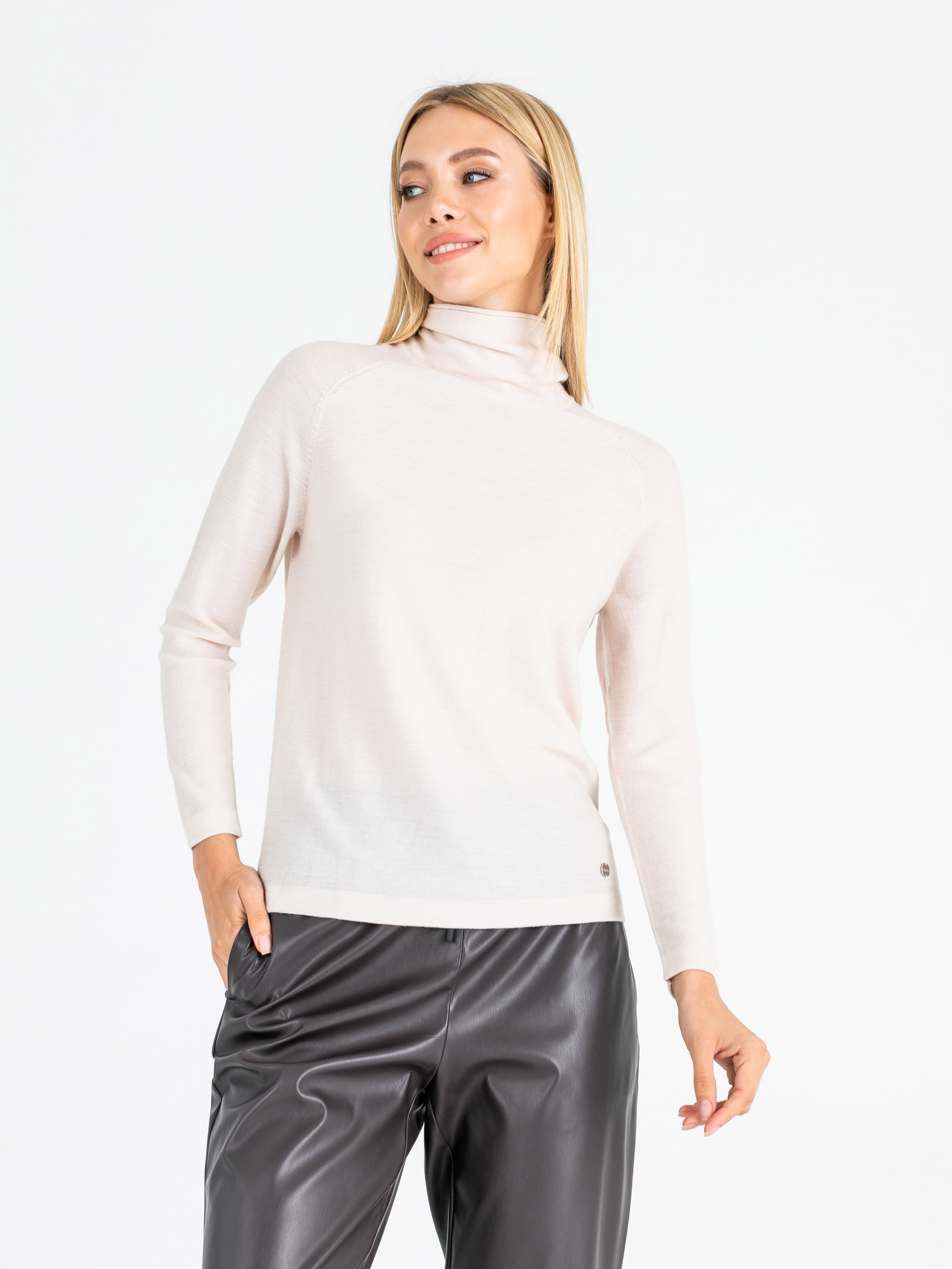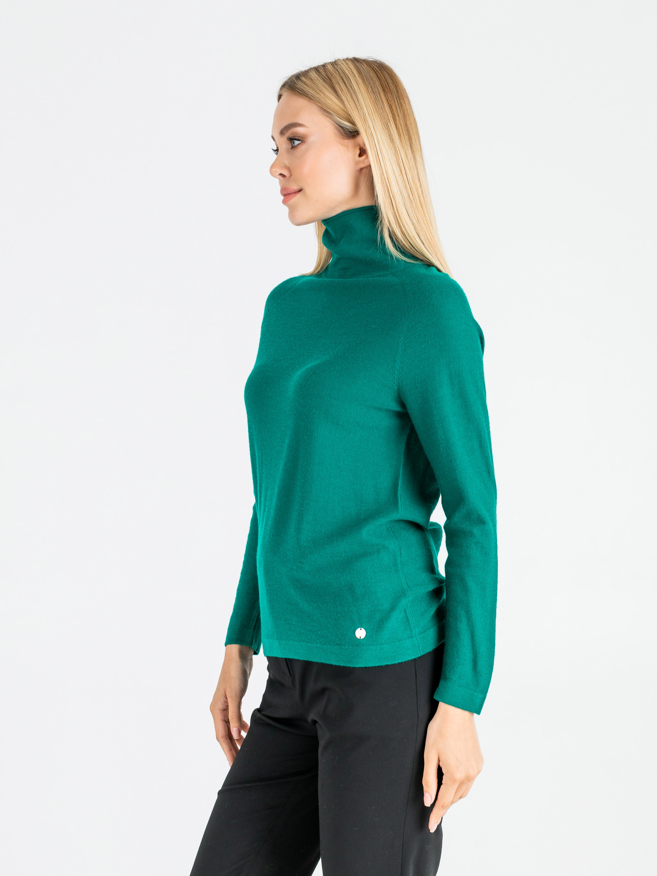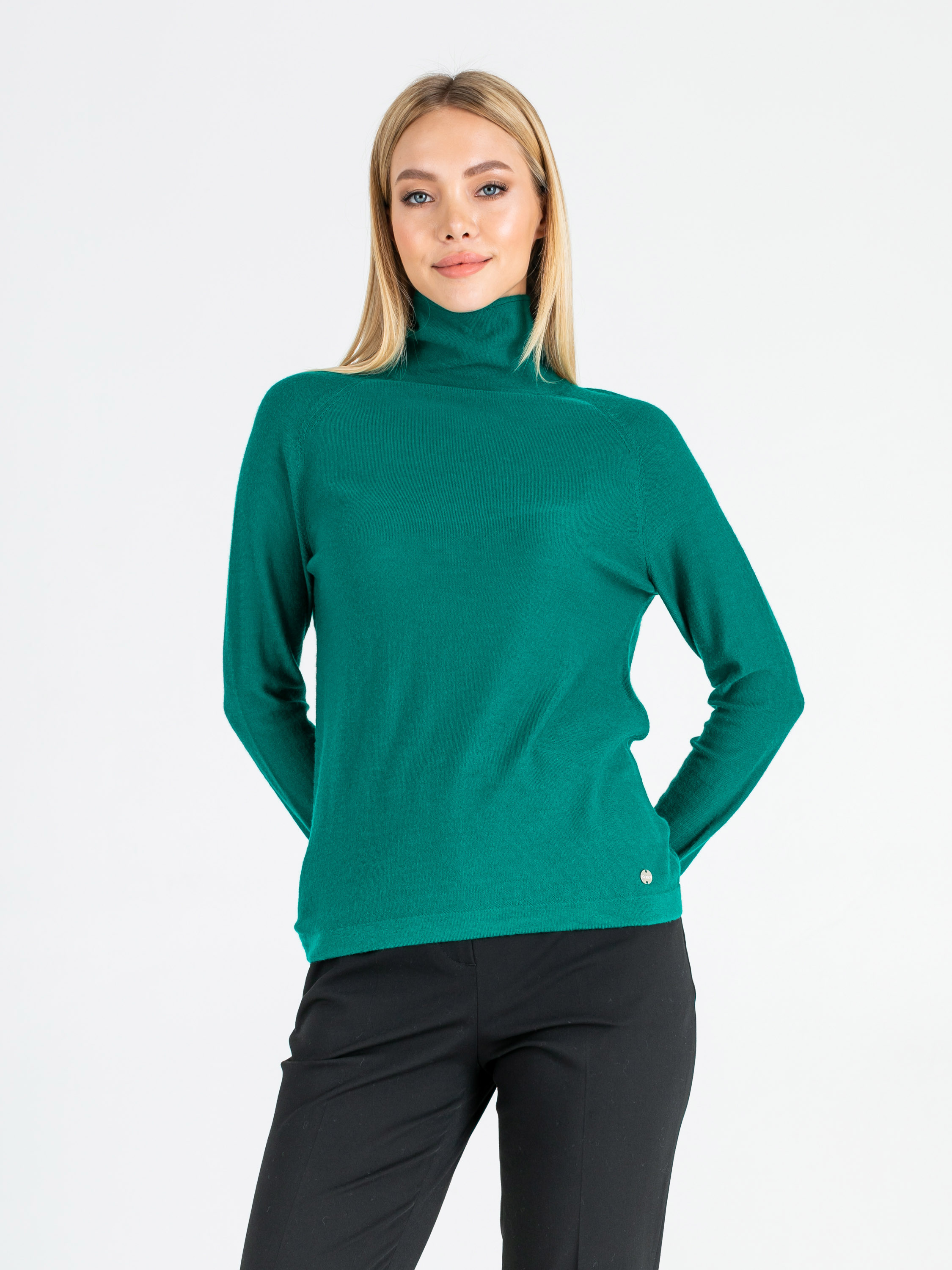 На сайте указаны российские размеры. Ткань: высококачественная 100% шерсть мериноса. Крой: слегка приталенный джемпер с высоким горлом по типу водолазки надежно защищает вас от холода и резких порывов ветра. Легкий, мягкий, приятный к телу он прекрасно садится по фигуре, подчеркивая ее достоинства. Не просвечивает, не подчеркивает нижнее белье. Представлен в двух стильных оттенках – изумрудно-зеленом и кремовом. Отделка: украшен круглым металлическим шильдиком, деликатно посвящающим окружающих в правильность вашего выбора. Базовая модель, сочетающаяся с любой деталью современного гардероба – брюками, юбками, сарафанами, кардиганами, джемперами. Рост модели 177 см