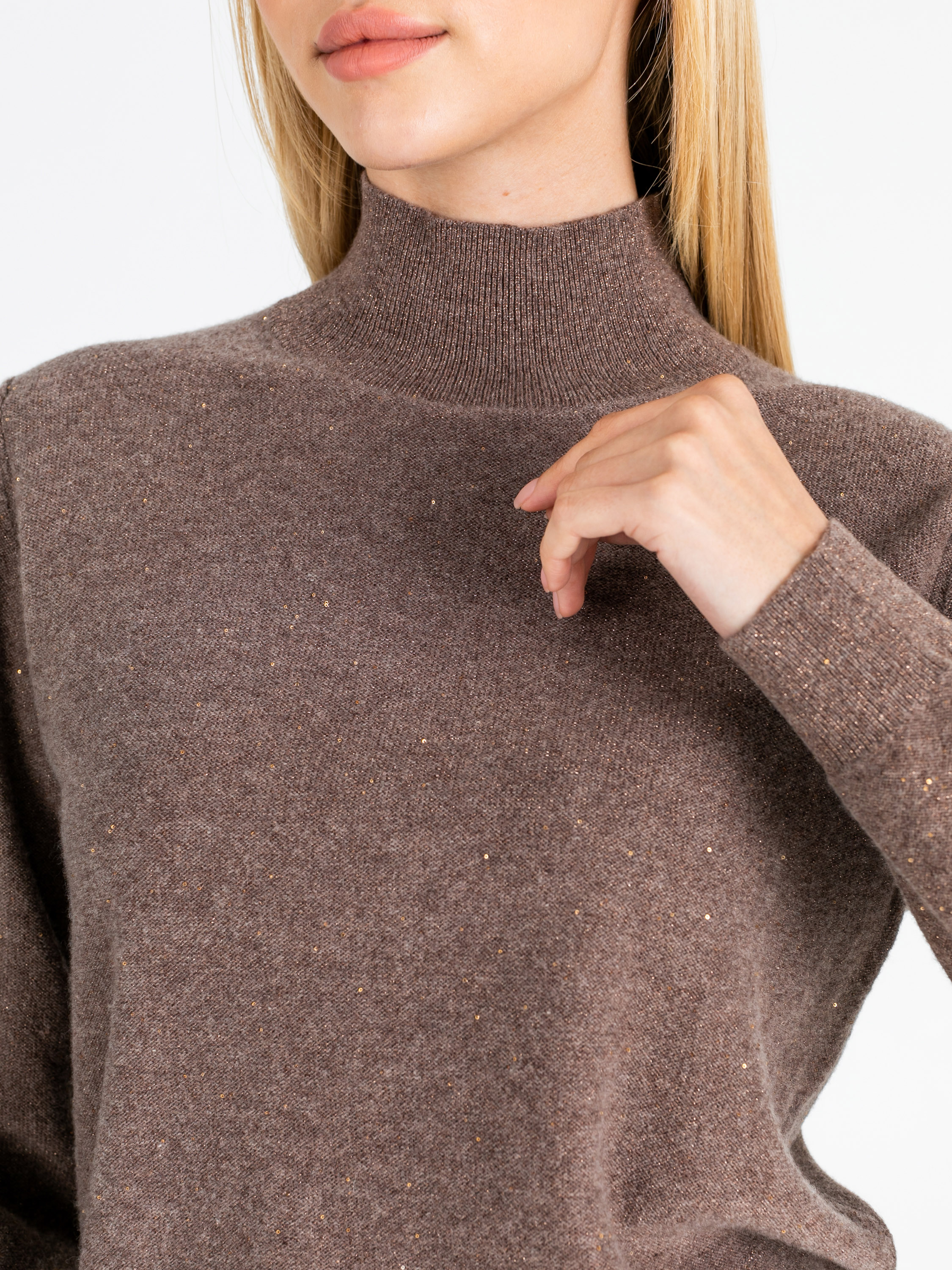 На сайте указаны Российские размеры. Ткань: 98% шерсть мериноса, 2% полиакрил. Крой: базовый однотонный джемпер приталенного силуэта. Модель, напоминающая привычную водолазку, выделяется длинным воротом-резинкой, который защищает от холода и ветра. Универсальная модель из шерсти мериноса – идеальный вариант для зимы и межсезонья. Джемпер представлен в двух стильных цветах – черном и коричневом. Отделка: легкое благородное сияние ткани придают прозрачные пайетки. Базовый компаньон для джинсов, брюк, джемперов, сарафанов, юбок и рубашек. Рост модели - 177 см