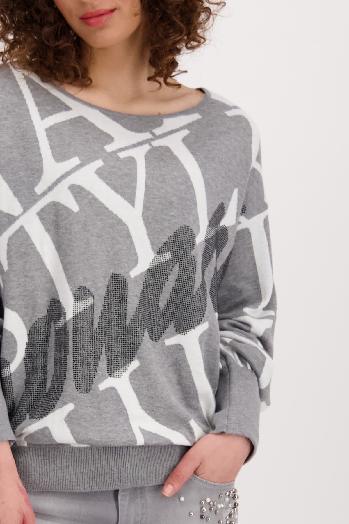 На сайте указаны российские размеры. Пуловер прямого кроя с круглым вырезом, широкой резинкой по низу и приятного качества из высококачественной смеси хлопка и полиамида для удобной посадки. Сплошной жаккард с надписями прерывается крупной надписью из страз в тон спереди и становится изюминкой дизайна. С гламурными джинсами облегающего кроя с драгоценными камнями для повседневного образа. Модель ростом 174 см.