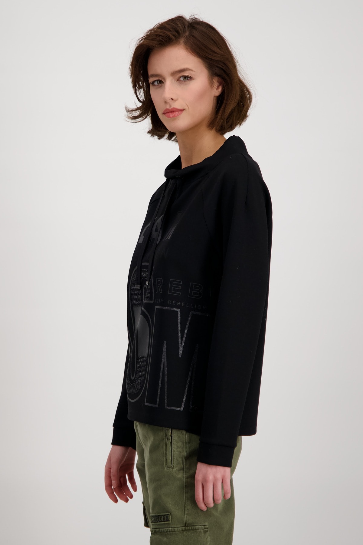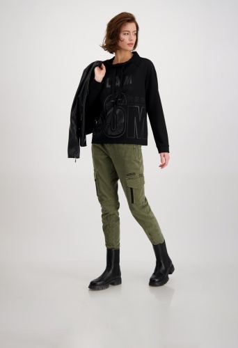 На сайте указаны российские размеры. Толстовка с воротником-стойкой и стразами. В толстовке с длинными рукавами от monari вы почувствуете удобную посадку. Благодаря красивой надписи с эффектными деталями из сверкающих стразов, блесток и лакового принта спереди модели удается стильно привлекать внимание. Стандартный крой поставляется с воротником-стойкой с кулиской, люверсами и завязками. Модель ростом 178 см.