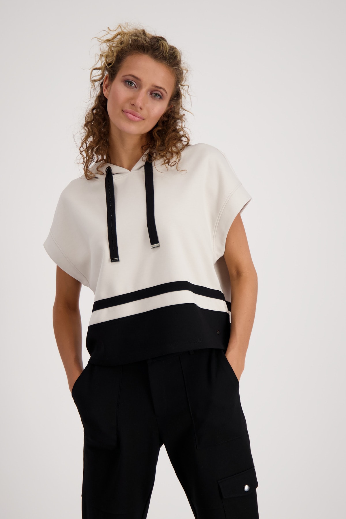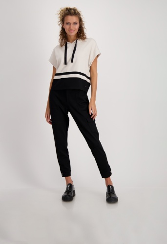 На сайте указаны российские размеры. Толстовка с капюшоном в стиле колор-блок. Комбинезон прямого кроя, капюшон с разделительным швом, кулиской, люверсами в виде колец и завязкой со сверкающими стразами, а также намеком на короткий рукав внахлест. Концы рукавов дополнены широкими манжетами. Модель ростом 176 см.