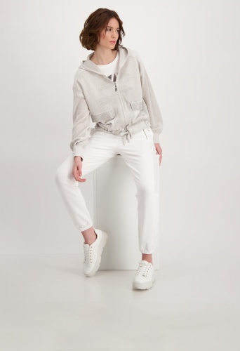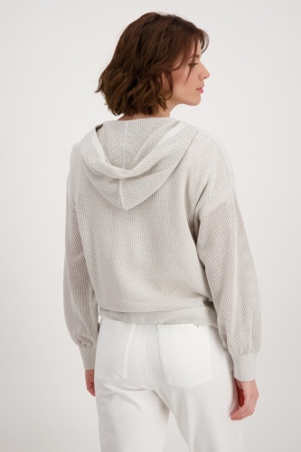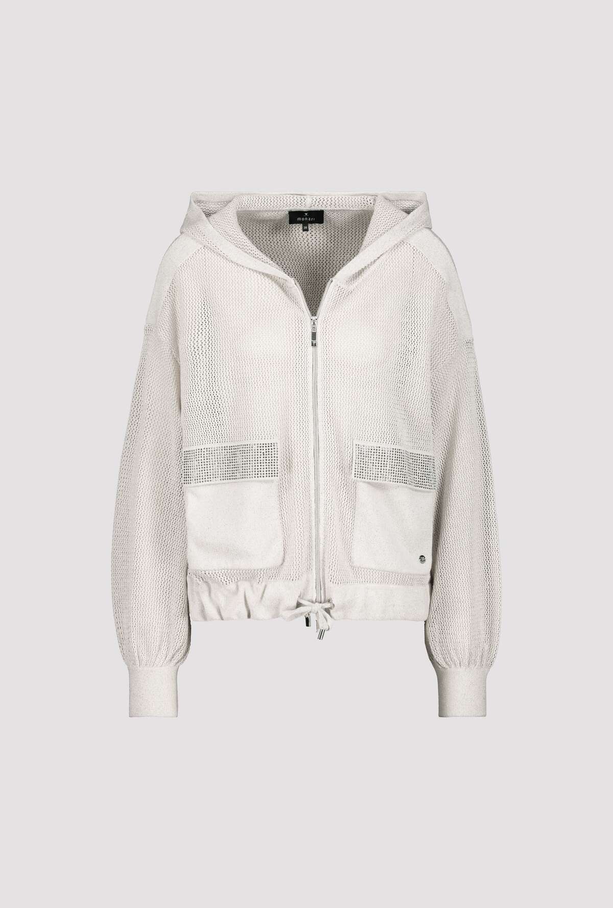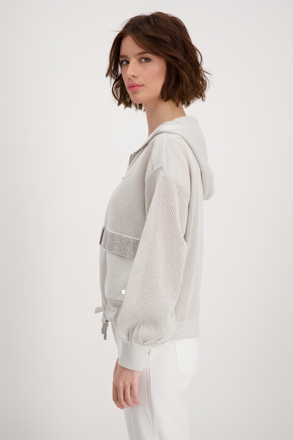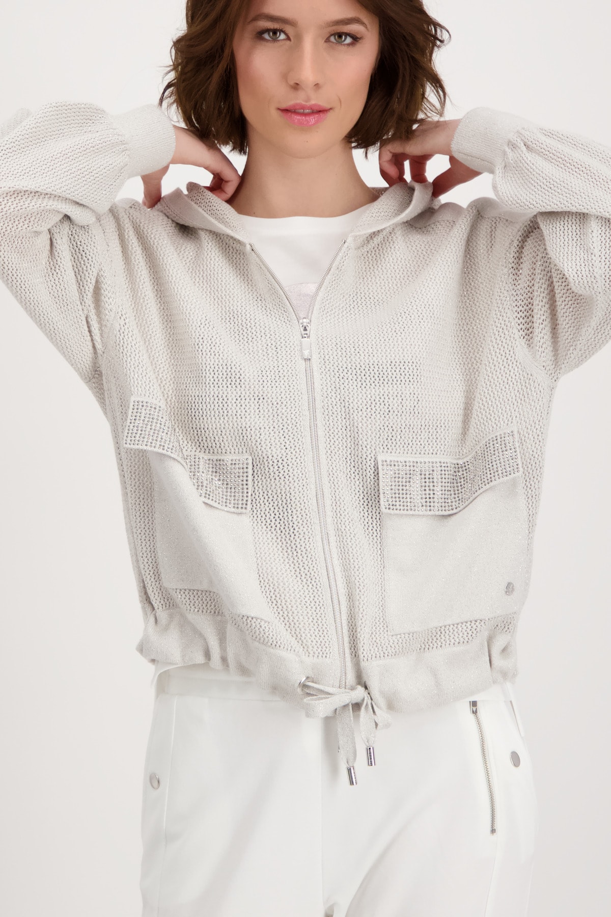 На сайте указаны российские размеры. Блестящий кардиган с накладными карманами и стразами. Модная модель сразу же впечатляет художественным узором ажурной вязки и сверкающими стразами на передних карманах с клапанами из накладного трикотажа. Прямой фасон с длинными рукавами и заниженной линией плеча позволяет создать повседневный образ. Кроме того, модель с крутыми вставками из трикотажа на плечах предлагает вам максимальный комфорт благодаря использованию высококачественного хлопка, смешанного с гламурной люрексовой пряжей. Подол с кулиской, кольцами и лентой для завязывания, а также концы рукавов дополнены широкими манжетами. Модель ростом 178 см.
