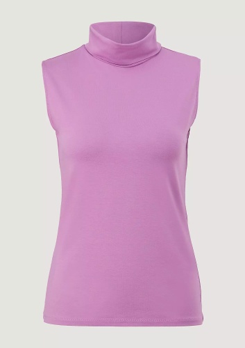 На сайте указаны российские размеры. Приталенный топ без рукавов с воротником-поло. Выполнен из эластичной мягкой ткани. Длина спины: 60 см в размере 42.