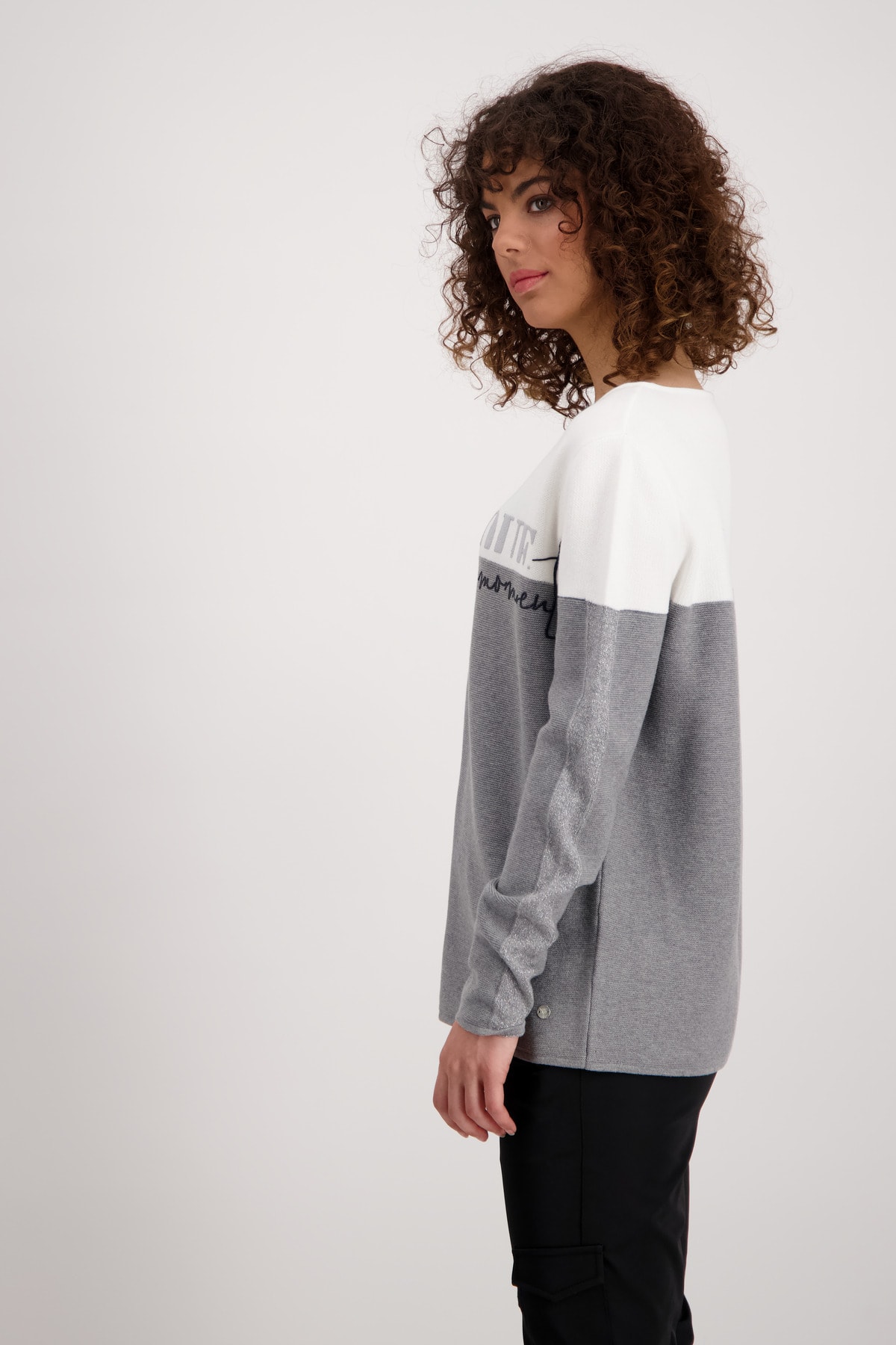 На сайте указаны российские размеры. Вязаный свитер в стиле колор-блок с длинными рукавами и принтом. Благодаря прямой форме с круглым вырезом обещается удобная посадка. Обработка высококачественного хлопка также способствует удобству ношения. Структура изнаночной вязки прерывается дизайном с цветовыми блоками и вставками лицевой глади с блестящим люрексом вдоль рукавов. Спереди видны 3D-резиновые надписи и гламурные 3D-надписи с блестками. Модель ростом 174 см Длина спины 44 размера 64 см.