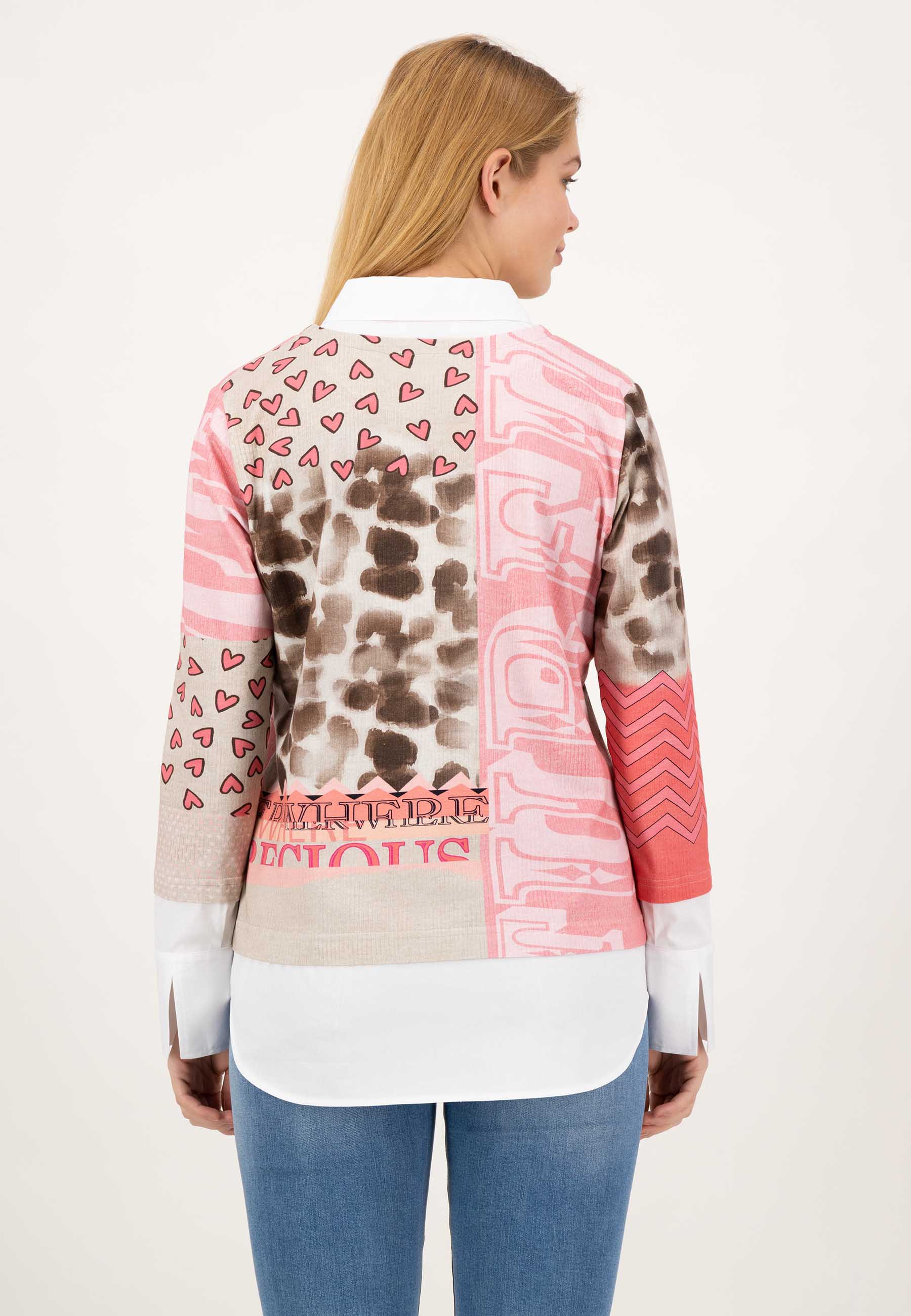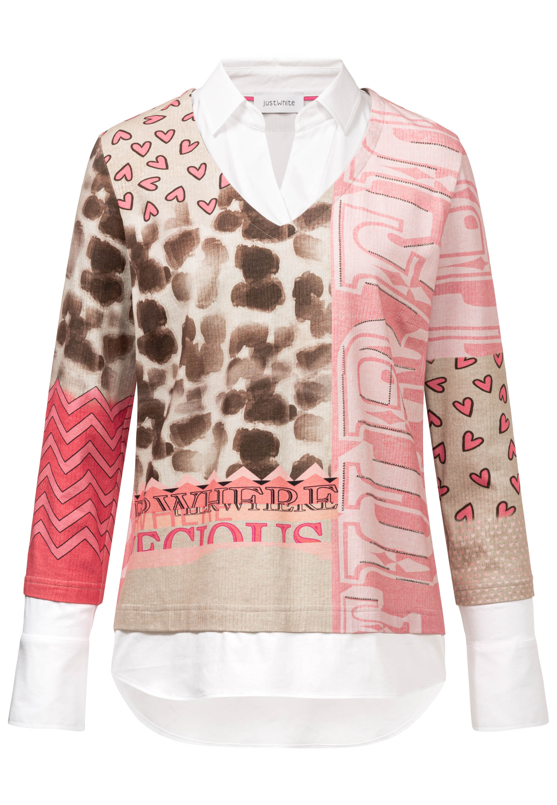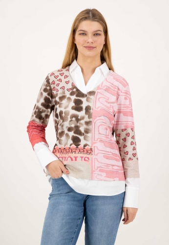 На сайие указаны российские размеры. Модная рубашка в образе 2-в-1 с притачной блузой с отложным воротником и деталями со стразами. рубашка с длинными рукавами с современным сплошным рисунком и встроенная блуза-рубашка. Воротник рубашки, манжеты и подол выполнены из тонкой ткани, прикрепленной к пуловеру, и создают оригинальный и в то же время практичный повседневный образ. Повседневный вырез рубашки и тонкое использование деталей со стразами делают его модным украшением на любой случай. Модель ростом 177 см. Измерения для 44 размера: Окружность груди: 104 см Талия: 101 см Ширина бедер: 110 см Длина спинки: 70 см. Длина рукава: 62 см.