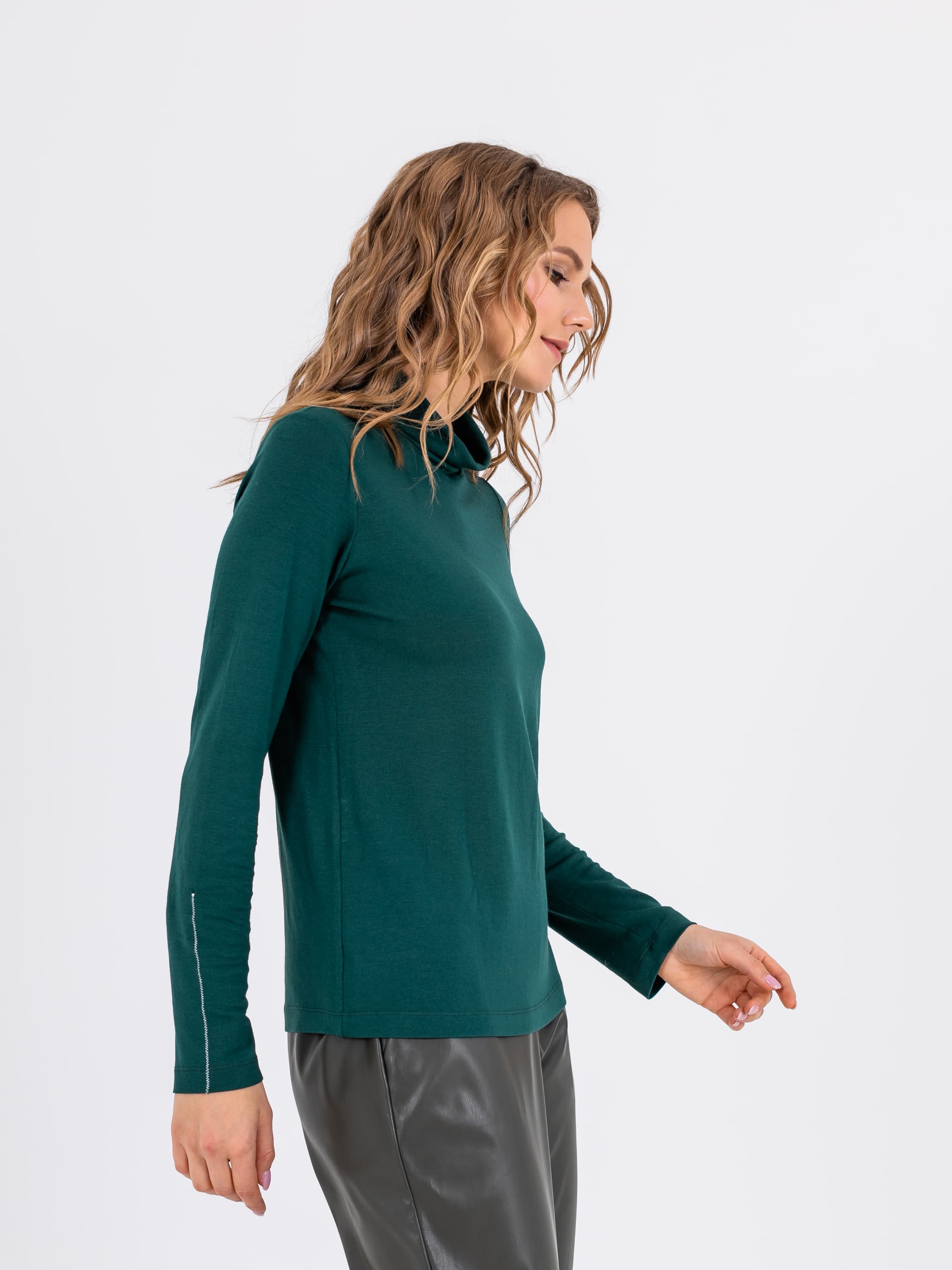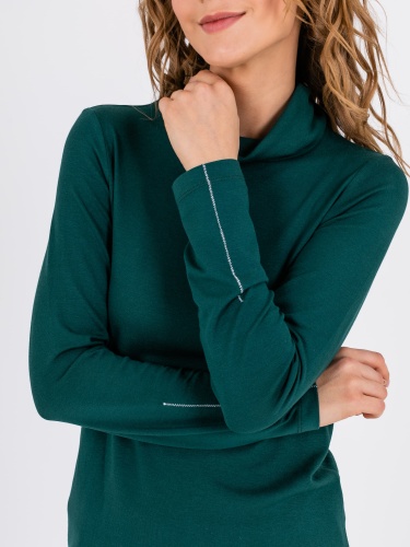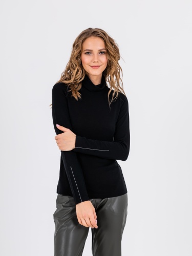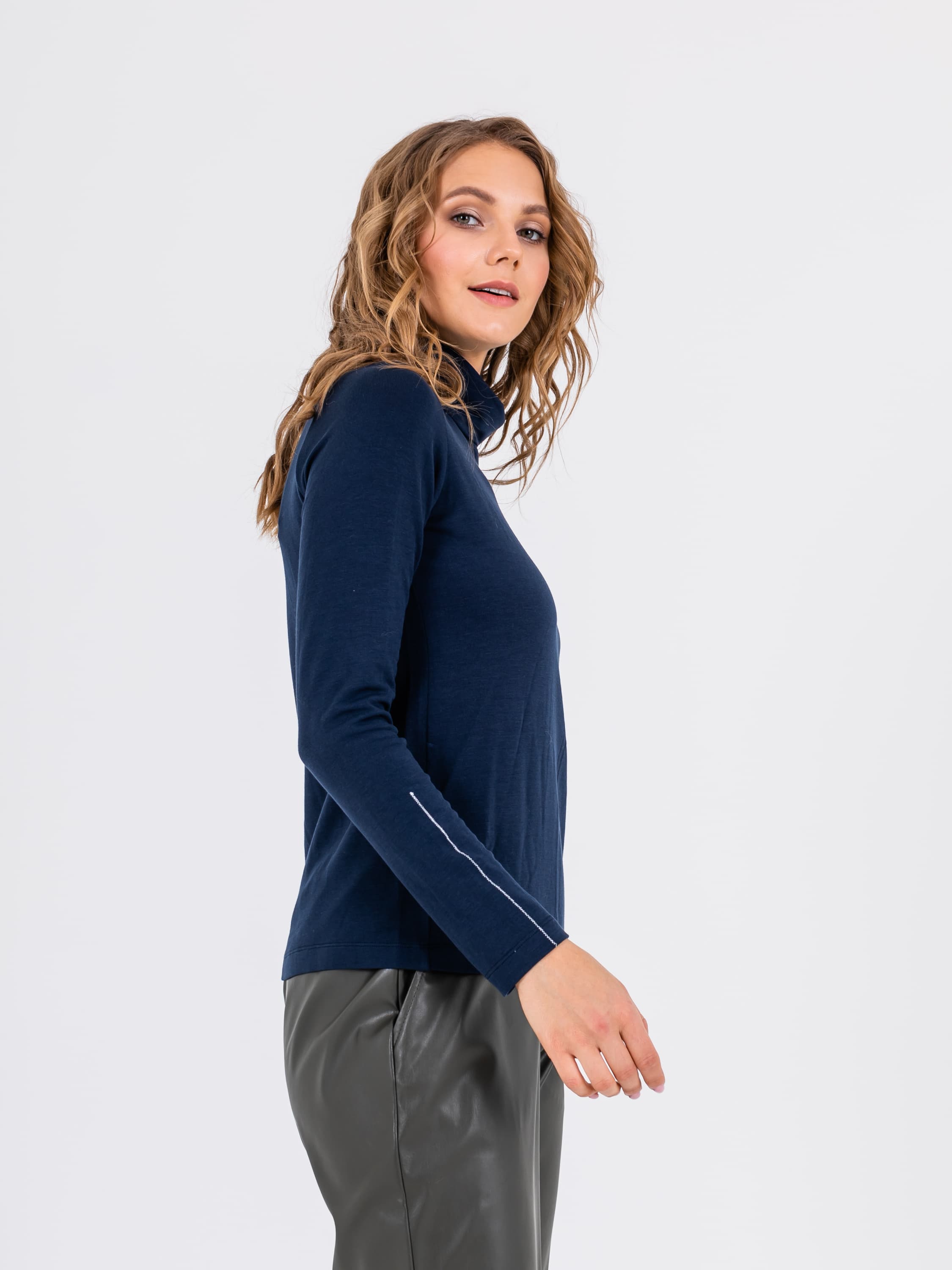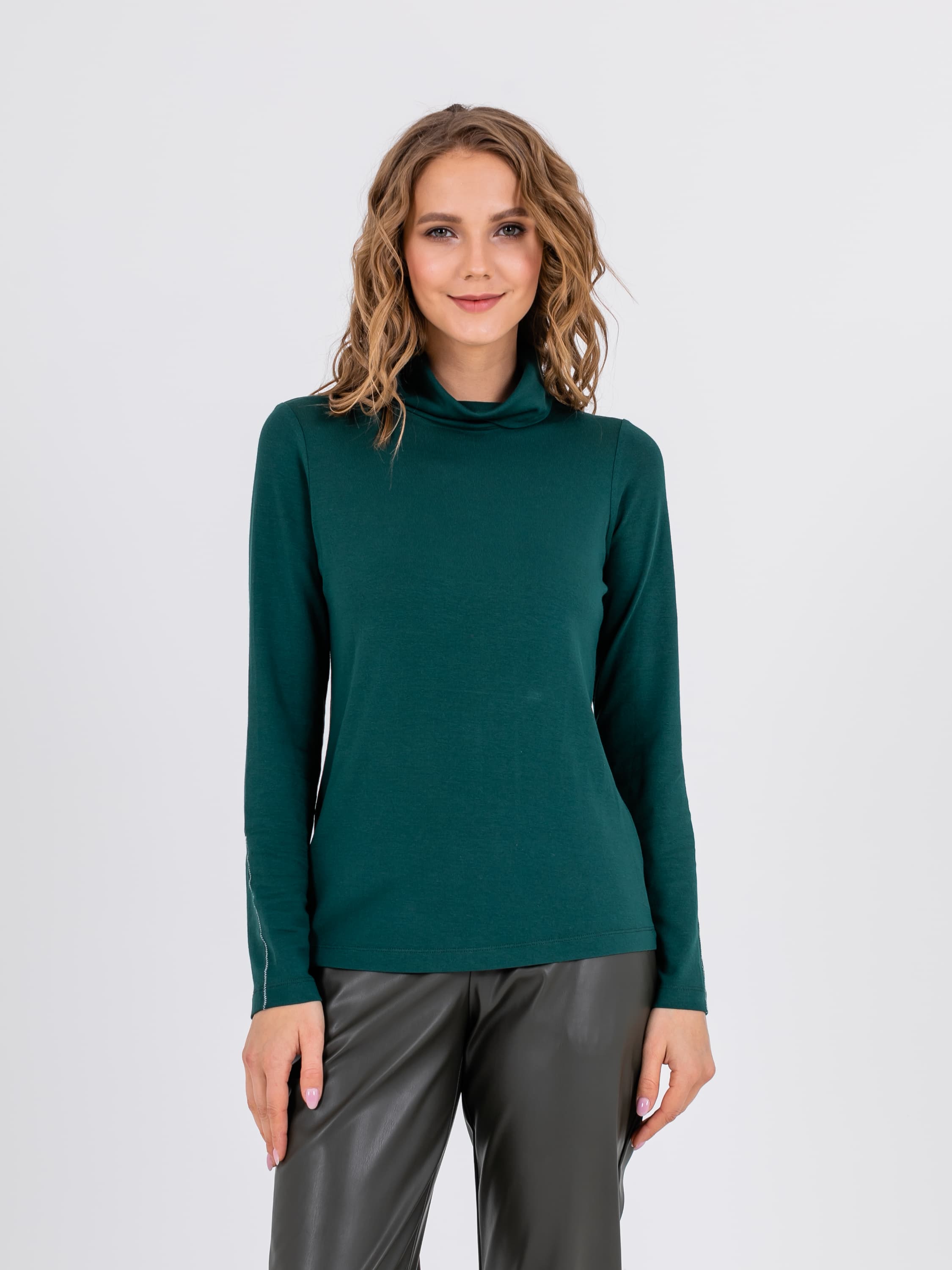 На сайте указаны российские размеры. Ткань: эластичная водолазка из комфортного и приятного в носке натурального тенсела (лиоцелла). Крой: приталенная водолазка с длинным свободным рукавом и подвернутым горлом – красота и тепло в действии. Достойная длина надежно прикрывает линию живота, изделие не поднимается при ходьбе и движении. Отделка: яркими элементами служат контрастные линии на конце рукавов и на спине водолазки. Они добавляют настроения и создают вертикаль, визуально удлиняющую силуэт. Универсальная модель удачно сочетается с джинсами и кожаными брюками, юбками, куртками, джемперами и пальто из коллекции Stern. Рост модели 175 см