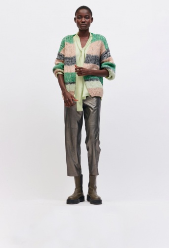 На сайте указаны российские размеры. Открытый кардиган из высококачественной итальянской смесовой шерсти с эффектом крапинки и узором в полоску. Повседневный крой дополнительно подчеркивается грубой вязкой. Модель ростом 178 см