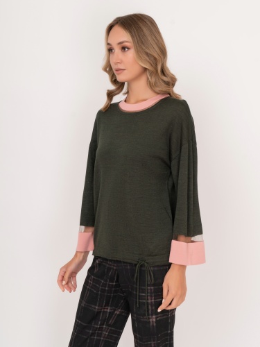 На сайте указаны российские размеры. Прямой трикотажный хаки джемпер с круглым вырезом, с длинным рукавом 7/8, с кулиской понизу, с розовыми и прозрачными вставками по горловине и на рукавах. Рост модели: 175 см. Длина джемпера: 56 см.