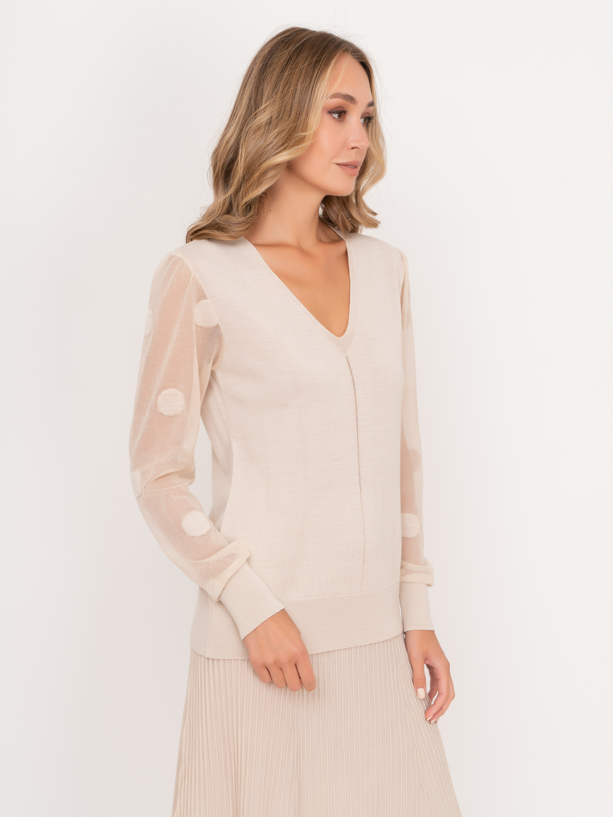 На сайте указаны российские размеры. Прямой трикотажный светло-бежевый джемпер с V-образным вырезом, с длинным прозрачным рукавом в крупный горох, с акцентной полосой по центру. Рост модели: 175 см. Длина джемпера: 60 см.