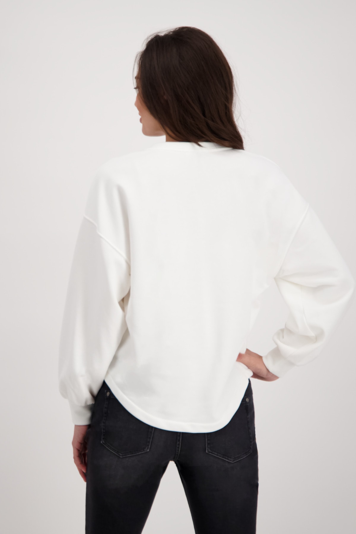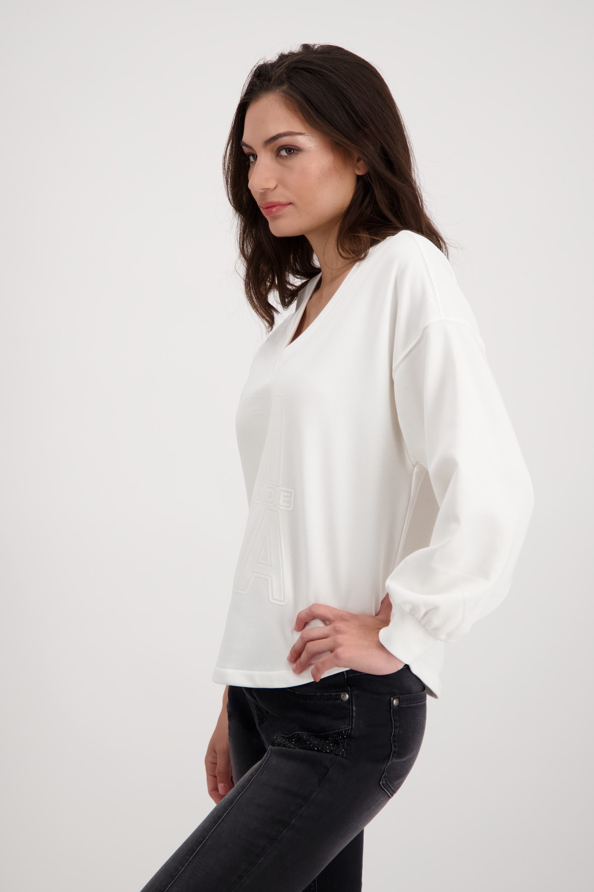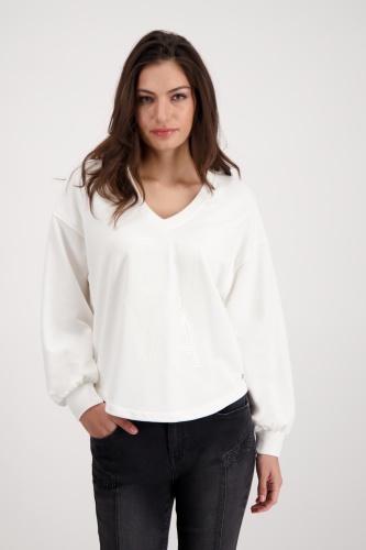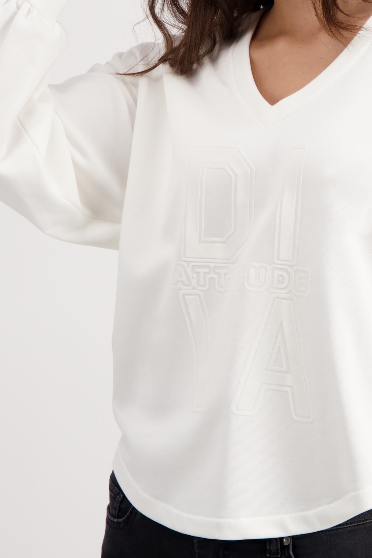 На сайте указаны российские размеры. Толстовка с длинными рукавами, V-образным вырезом и принтом. Длинные рукава с приспущенной линией плеч заканчиваются широкой манжетой с воланами. Прямой фасон дополняется V-образным вырезом и закругленным низом, а передняя часть украшена объемной надписью в тон. Вы чувствуете себя наиболее комфортно в простых и удобных топах? Тогда вам не обойтись без этой модели. Рост модели: 179 см. Длина по спине: 68 см.