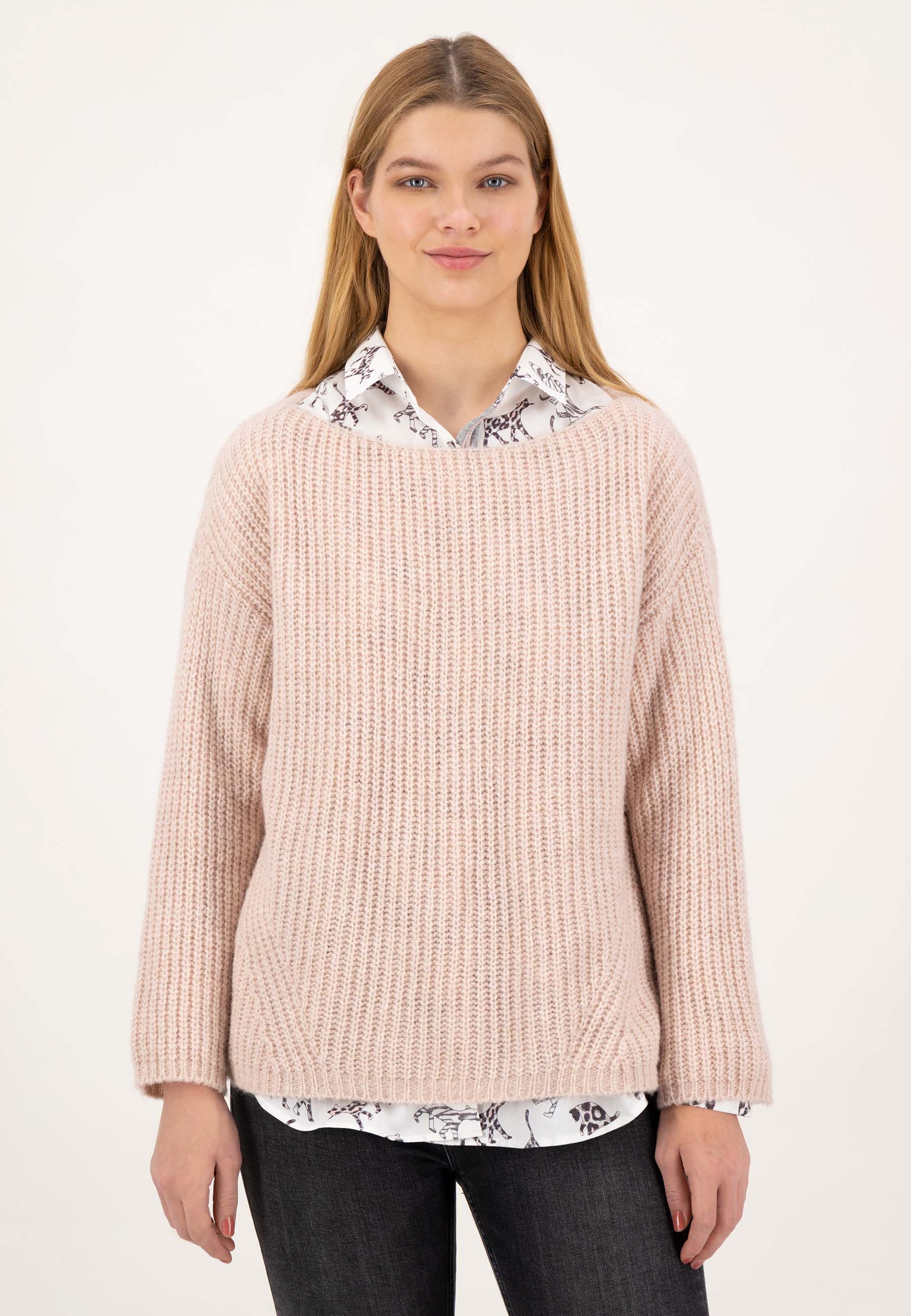 На сайте указаны российские размеры. Повседневный вязаный свитер свободного покроя. Сочетание высококачественных материалов делает свитер приятным и мягким в носке. Благодаря тонкой и асимметричной структуре вязания свитер с круглым вырезом станет повседневным комбинированным элементом для непринужденного образа. Рост модели: 177 см. Измерения для 44 размера : Окружность груди: 62 см Бедра: 58 см Длина по спинке: 58 см. Длина рукава: 60 см.