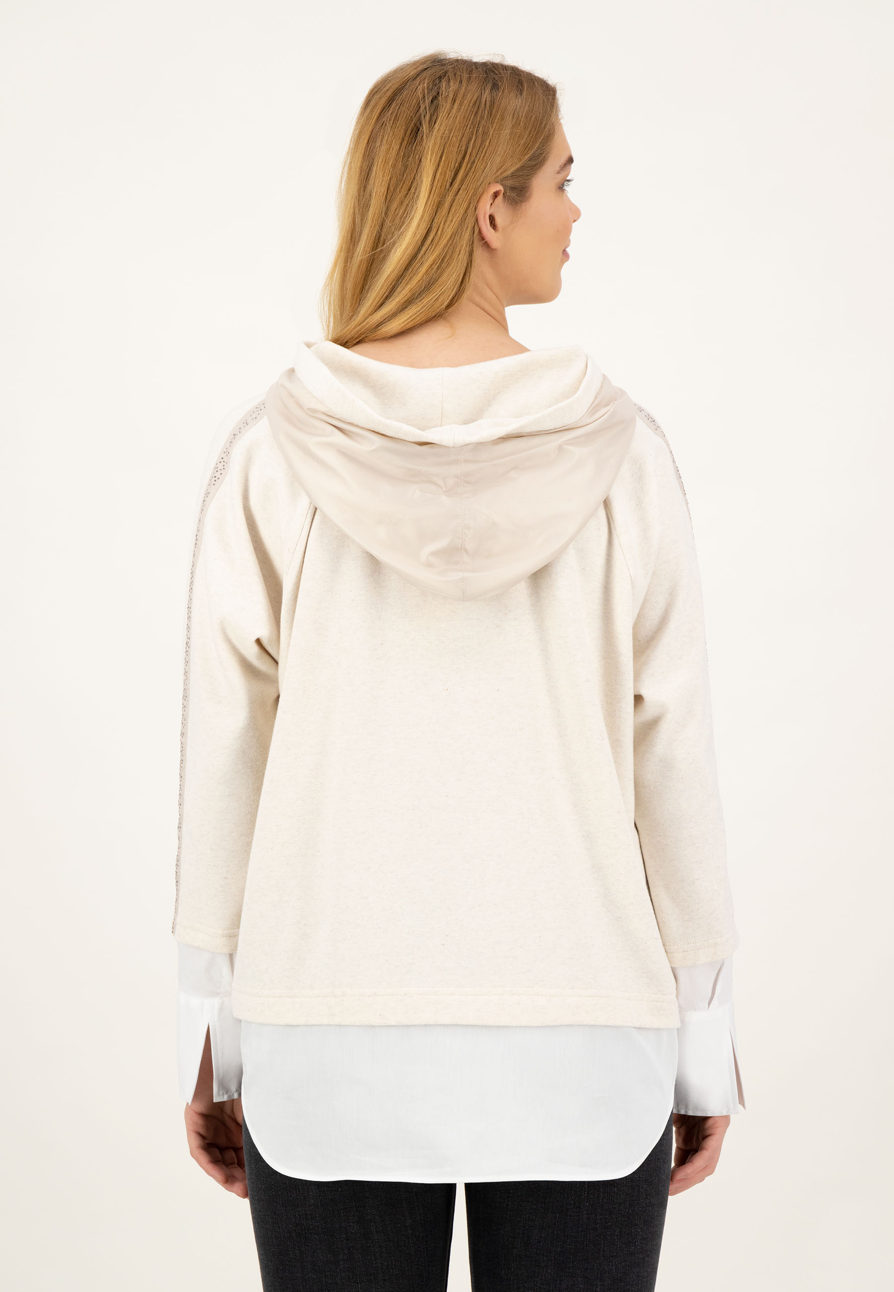 На сайте указаны российские размеры. Удобный пуловер с капюшоном, блузочной вставкой и блестящими деталями. Простая толстовка с капюшоном сочетает в себе все эти свойства со встроенной блузочной вставкой. Капюшон привлекает особое внимание, так как выполнен из слегка мерцающего атласа и умело выделяется на фоне остального потового материала. Модель ростом 177 см Измерения для 44 размера: Окружность груди: 113 см Обхват бедер: 112 см Длина спинки: 70 см Длина рукава: 71 см