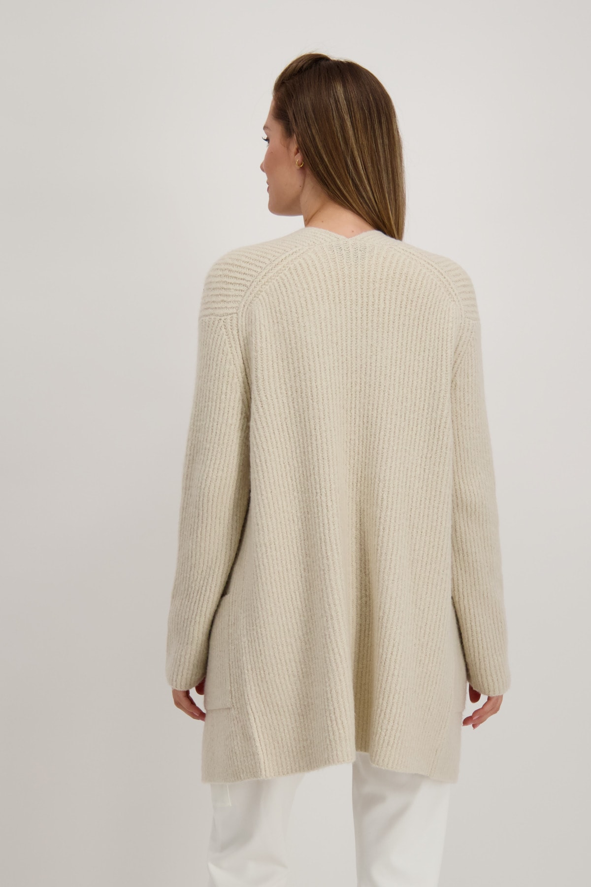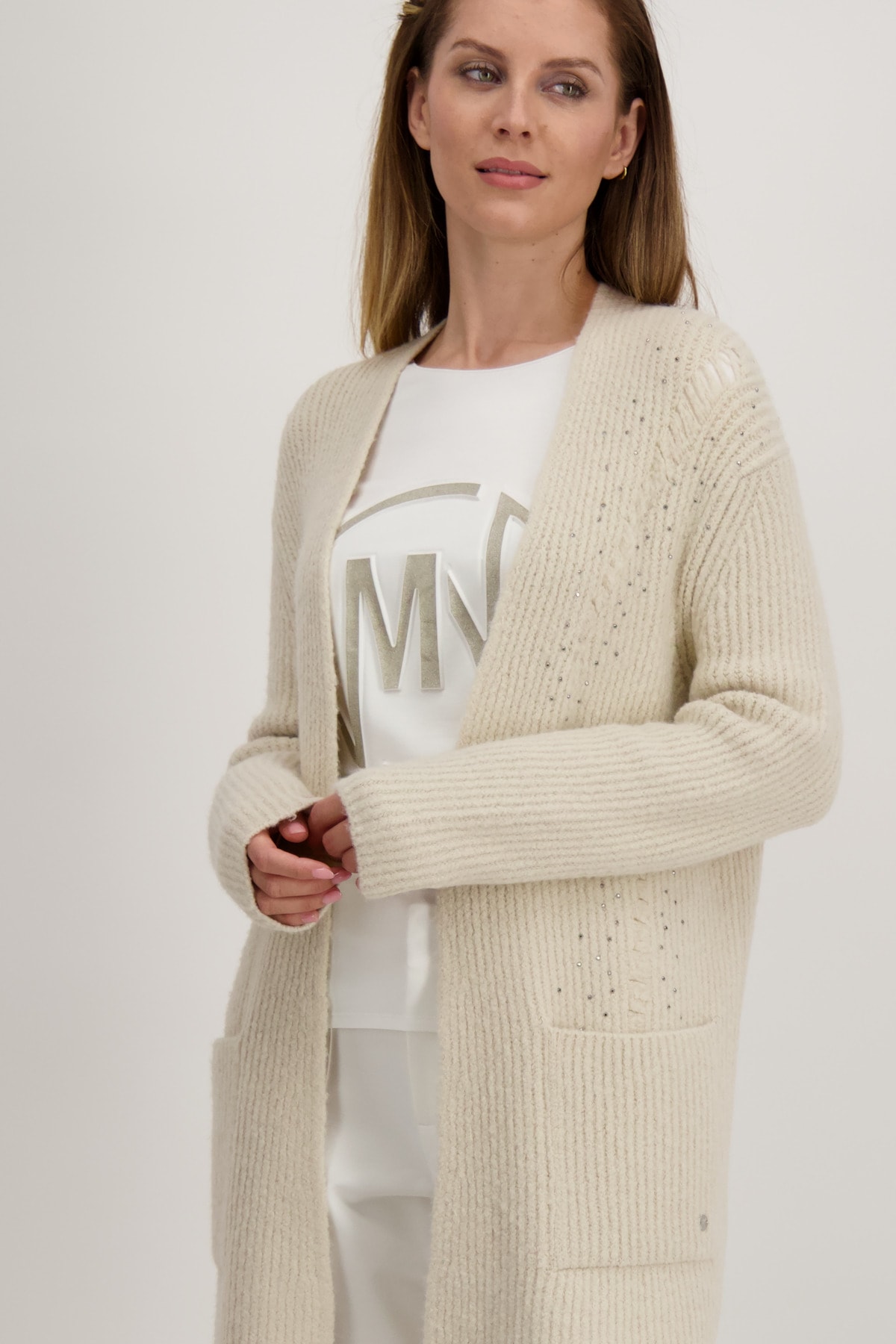 На сайте указаны российские размеры. Открытый кардиган оверсайз с карманами и стразами. Однотонный кардиган от monari искусно приправлен рваными секциями со сверкающими стразами спереди. Состав мягкого материала обеспечивает идеальное ощущение комфорта, а длинная прямая форма обеспечивает удобную посадку. Модель без застежки носится стильно в расстегнутом виде, поэтому полностью комбинируемая модель — это всегда выбор для многих случаев. Модель ростом 178 см. Длина спины 44 размера 78 см.