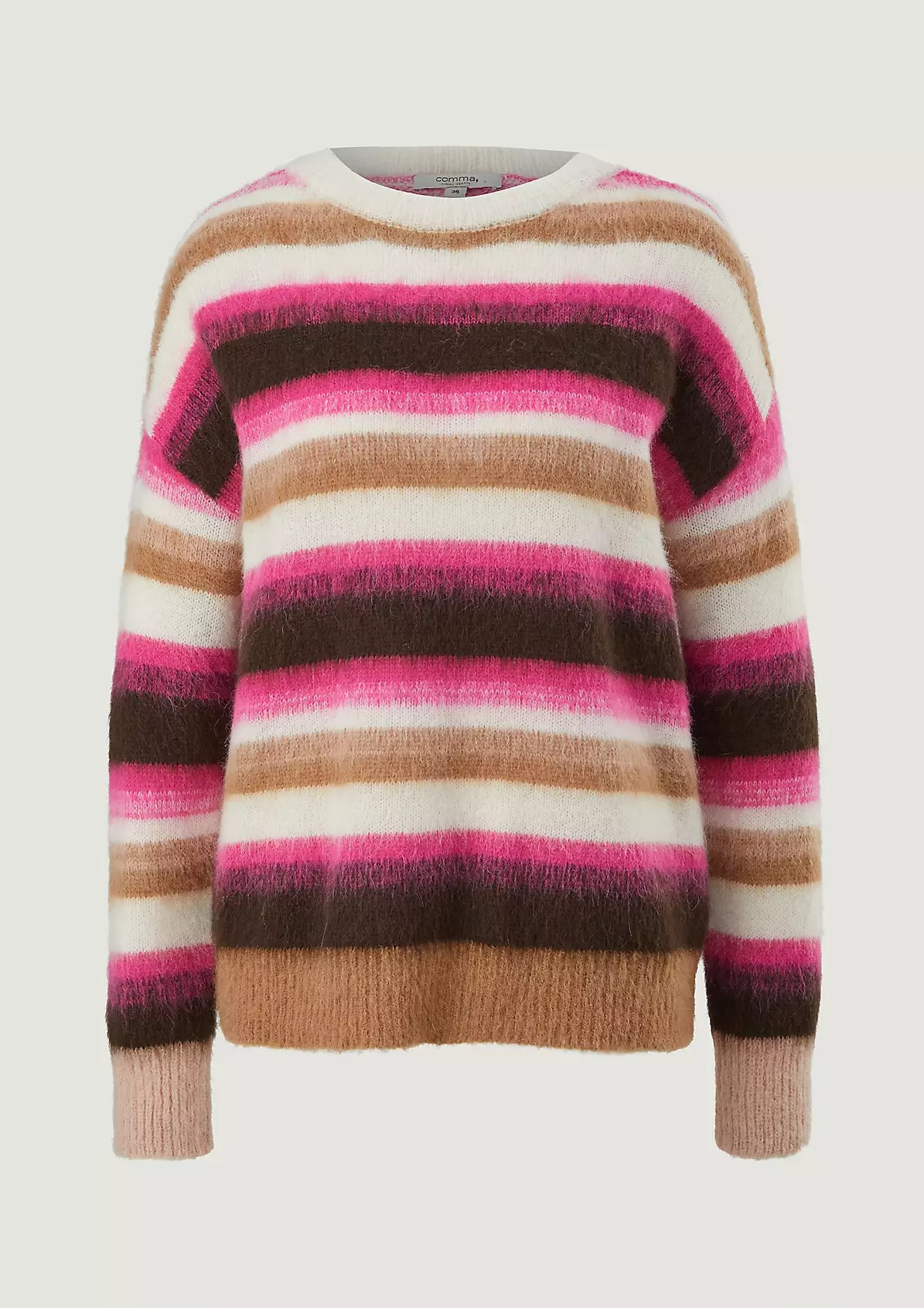 На сайте указаны российские размеры. Вязаный джемпер с полосками градуированного цвета. Круглый вырез горловины. Длинные рукава с манжетами в рубчик, заниженная линия плеча. Подол с ребристой отделкой. Длина спины 64 см в размере 42.