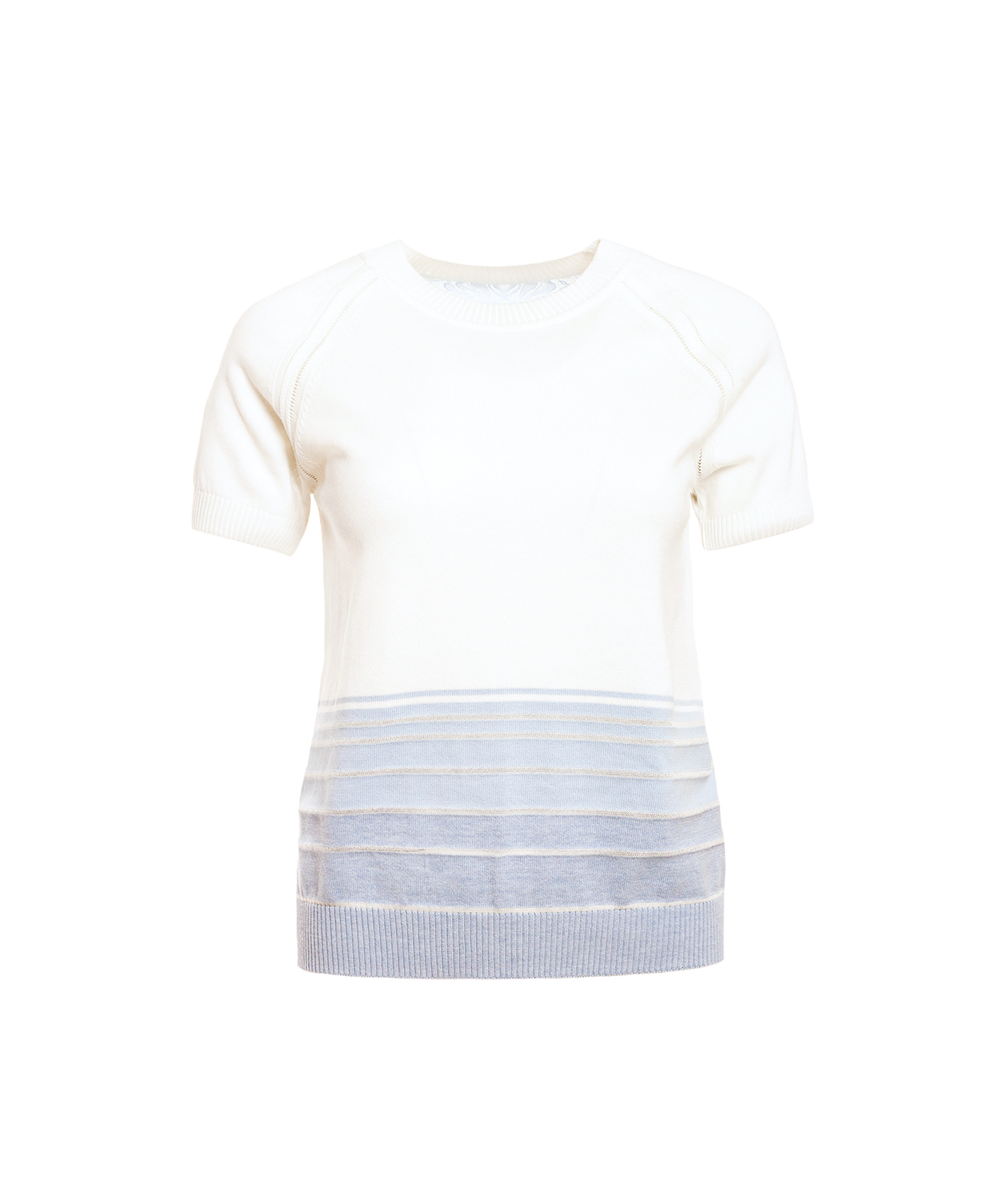 Джемпер прямого кроя. Короткие рукава реглан с ажурными элементами вдоль линии шва, круглый вырез горловины. Кружевная вставка на спинке.