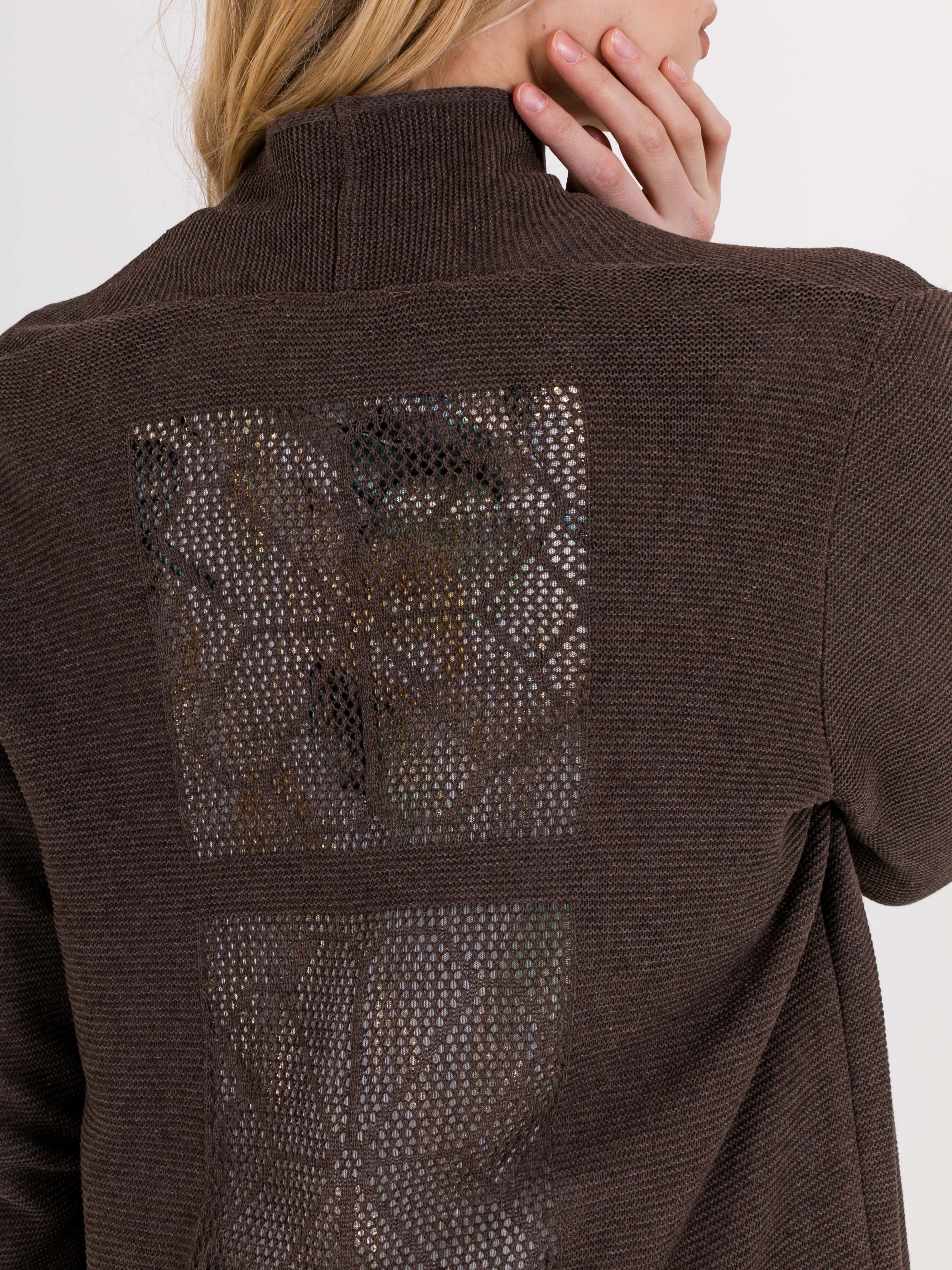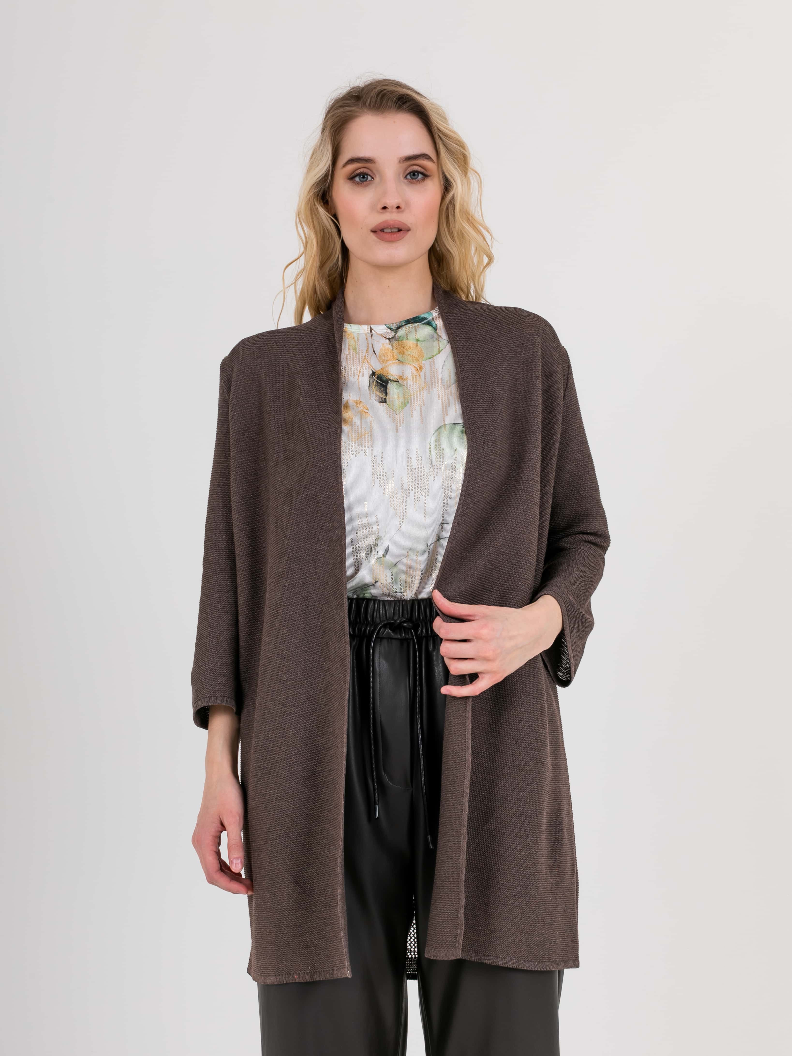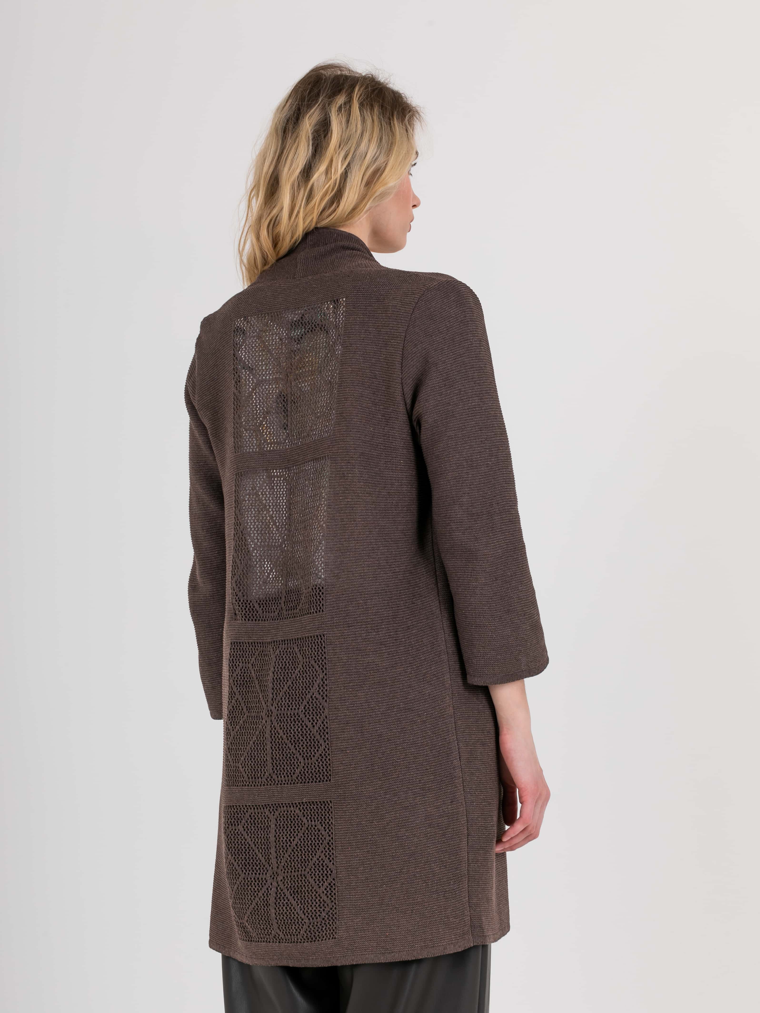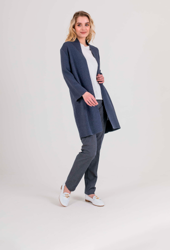 На сайте указаны российские размеры. Кардиган прямого силуэта длиной до середины бедер, из легкого хлопка с добавлением полиакрилонитрила. На спинке выполнен эффектный геометрический узор. Длинные втачные рукава со спущенной линией плеча. Горловина обработана небольшой стойкой.