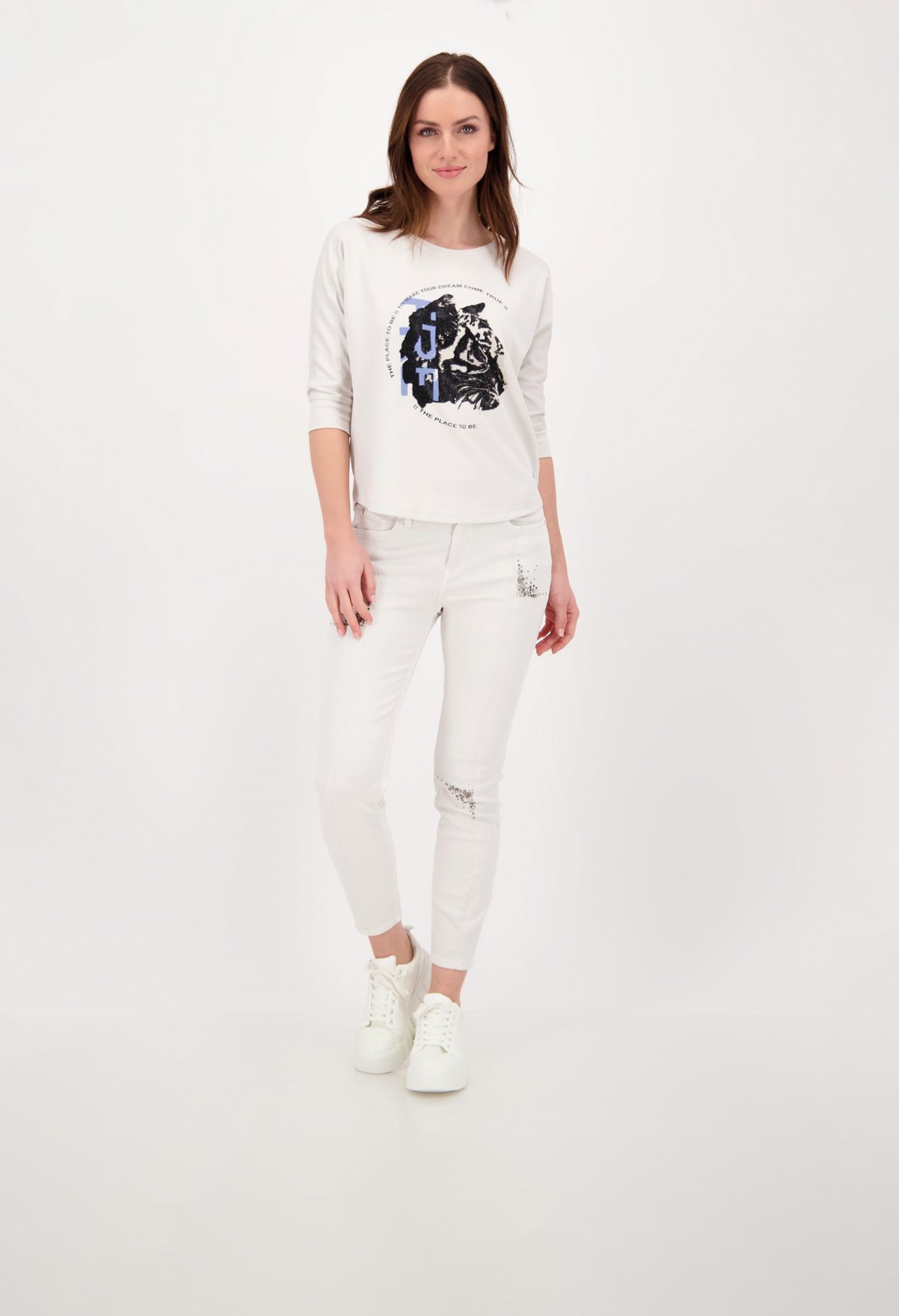 На сайте указаны российские размеры. Рубашка из джерси 3/4 с анималистичным принтом и стразами. Перед украшен крутым анималистическим принтом в виде головы тигра со сверкающими стразами и крутыми надписями. Блестящий оверлочный шов на круглом вырезе, на плече и вдоль длинных рукавов завершает дизайн женской рубашки. Закругленный низ и широкие манжеты на кромке рукава 3/4 не только гарантируют стильную деталь, но и удобную посадку, а струящаяся вискоза в миксе и эластичный материал также приятны для кожи. Длина по спинке 44 размера составляет 62 см. Модель ростом 179 см