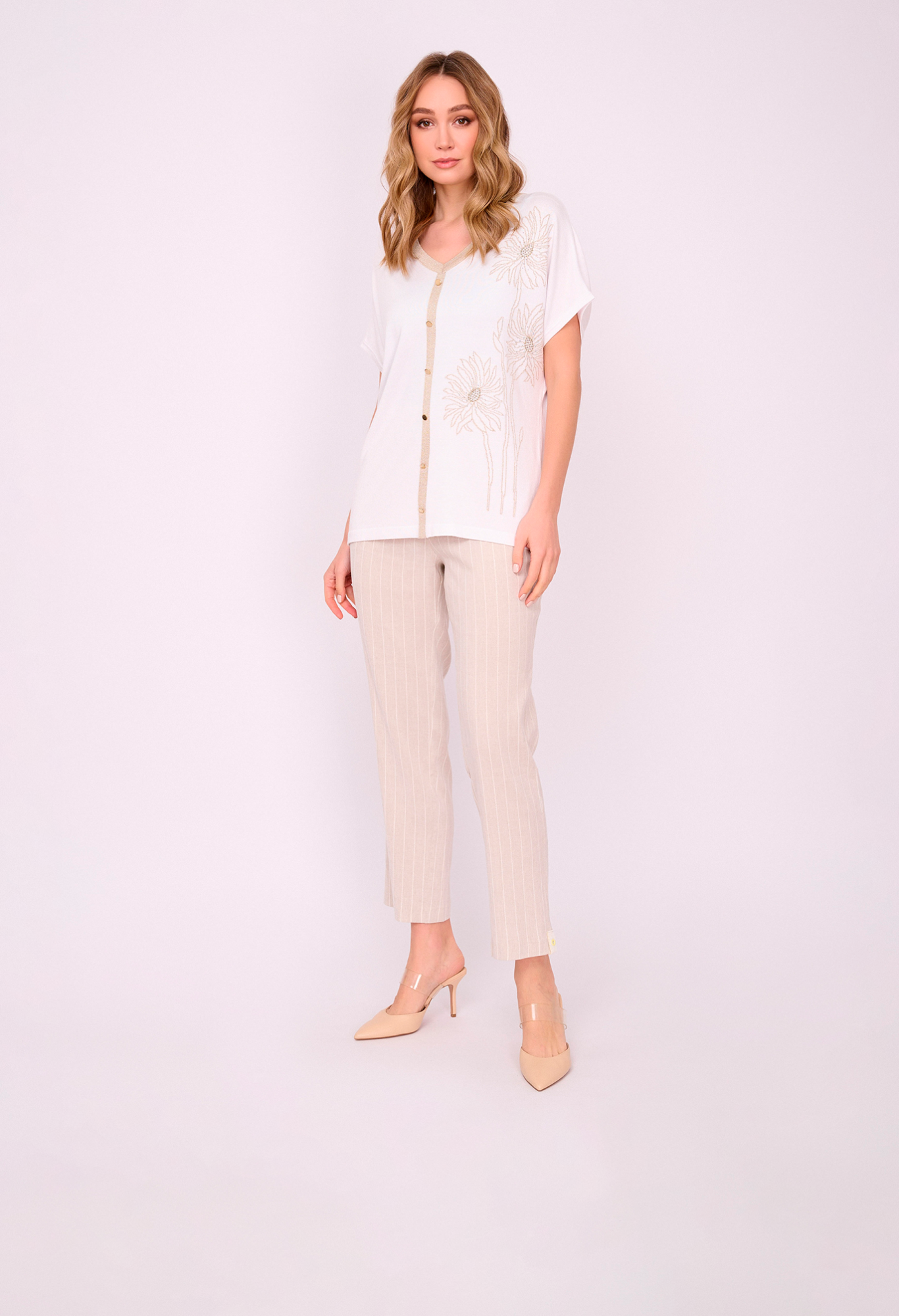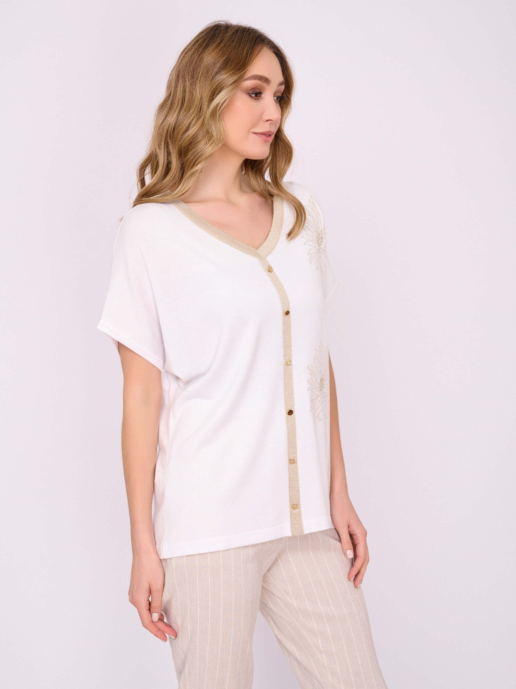 На сайте указаны российские размеры. Трикотажный прямой белый пуловер с V-образным вырезом, с коротким рукавом, с золотистыми вставками и с золотистым цветочным рисунком, с декоративными пуговицами и стразами. Длина по спинке: 63 см. Рост модели: 175 см.