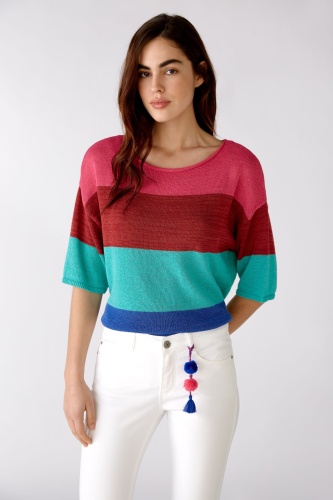 Немецкий бренд. На сайте указаны Российские размеры. Свободный фасон со спущенными плечами и короткими рукавами. Летний вырез-лодочка с закругленными краями. Узкие ребристые манжеты на руке. Закрученный край на кромке.