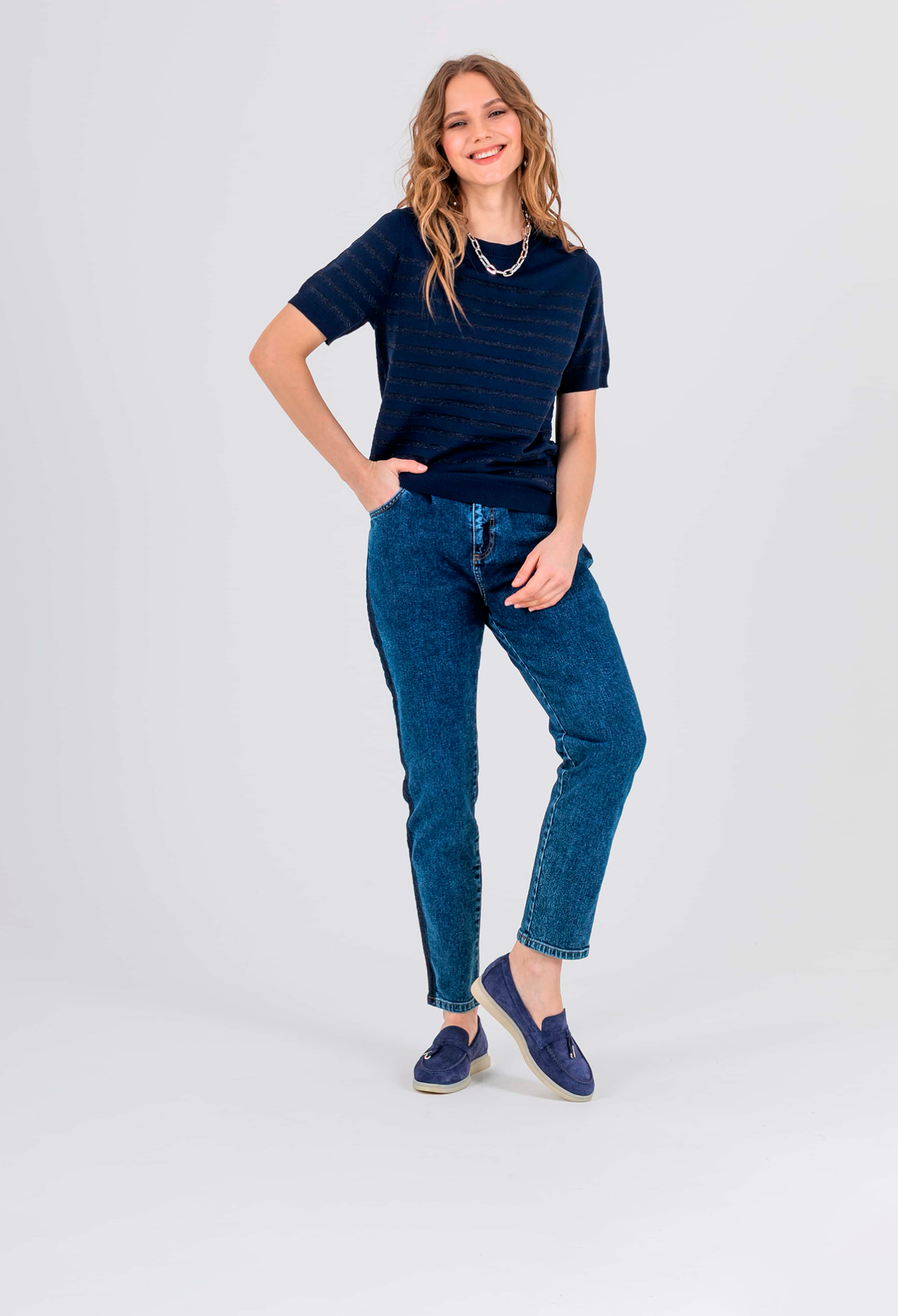 Укороченная футболка прямого силуэта в полоску из легкой, мягкой вискозы с добавлением эластана. Перед и спинка по низу обработаны манжетой. Укороченные втачные рукава с манжетами. Круглый вырез горловины, обработанный трикотажной косой бейкой.