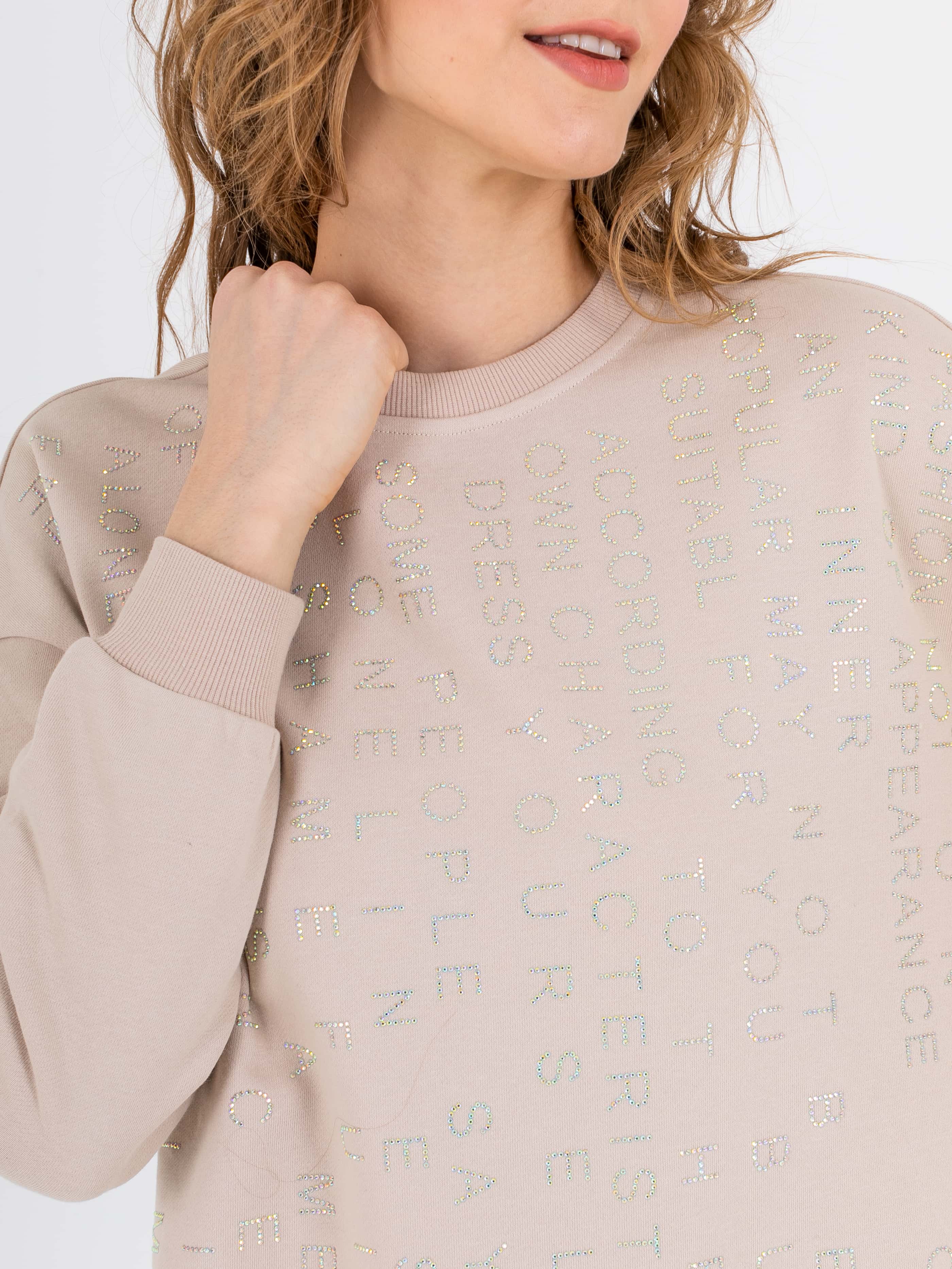 Свитшот прямого силуэта средней длины из легкого хлопка с добавлением полиэстера. Перед и спинка по низу обработаны манжетой. Перед украшен аппликациями в виде надписей из страз. Длинные втачные рукава со спущенной линией плеча и манжетами. Круглый вырез горловины.