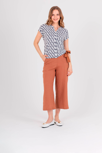 Футболка средней длины прямого силуэта из легкой, мягкой вискозы с добавлением эластана, дизайнерская особенность модели – яркий принт. Короткие цельнокроеные рукава с манжетами. Круглый вырез горловины с разрезом, обработан косой бейкой, которая переходит в декоративную планку по переду.