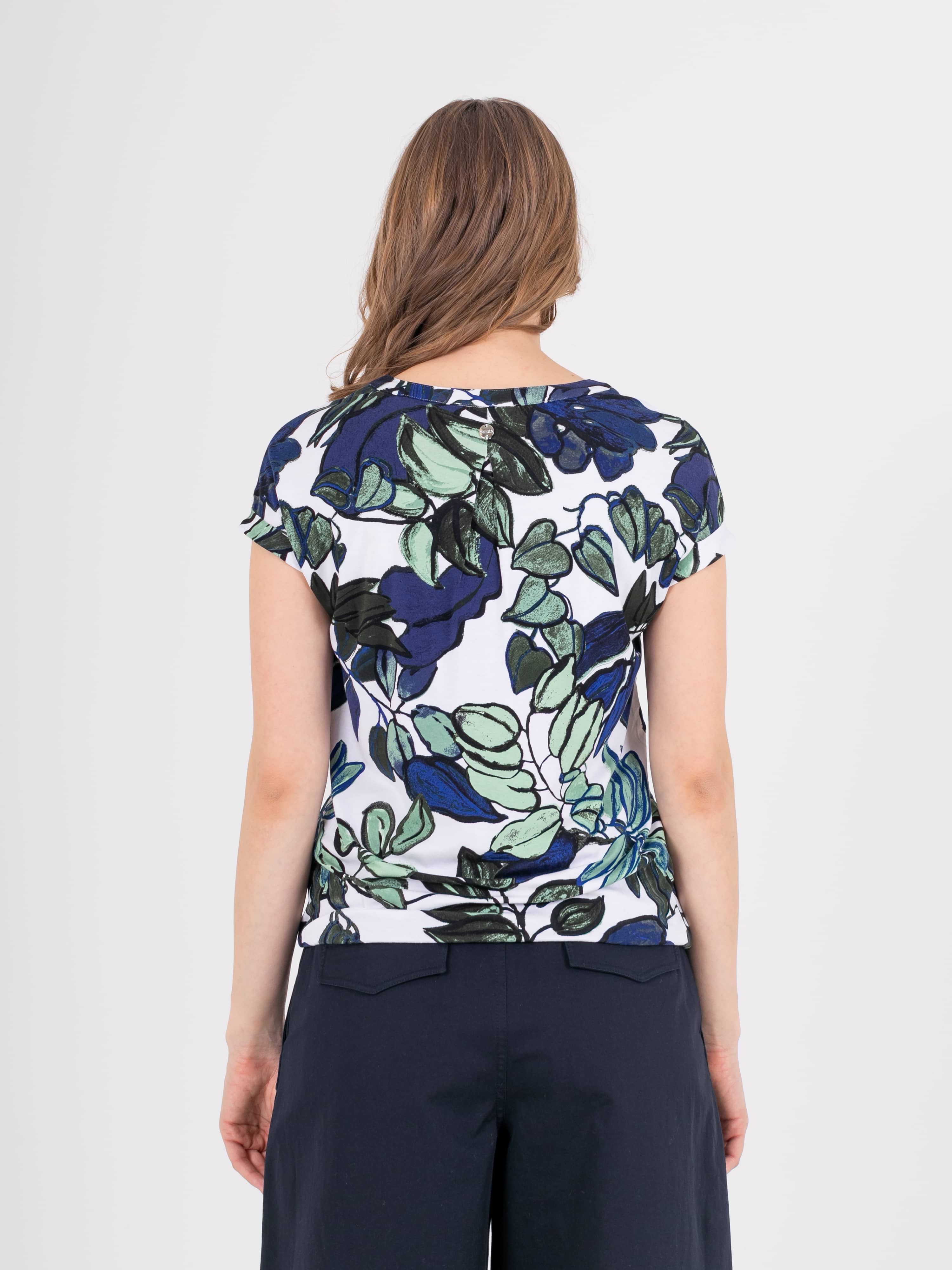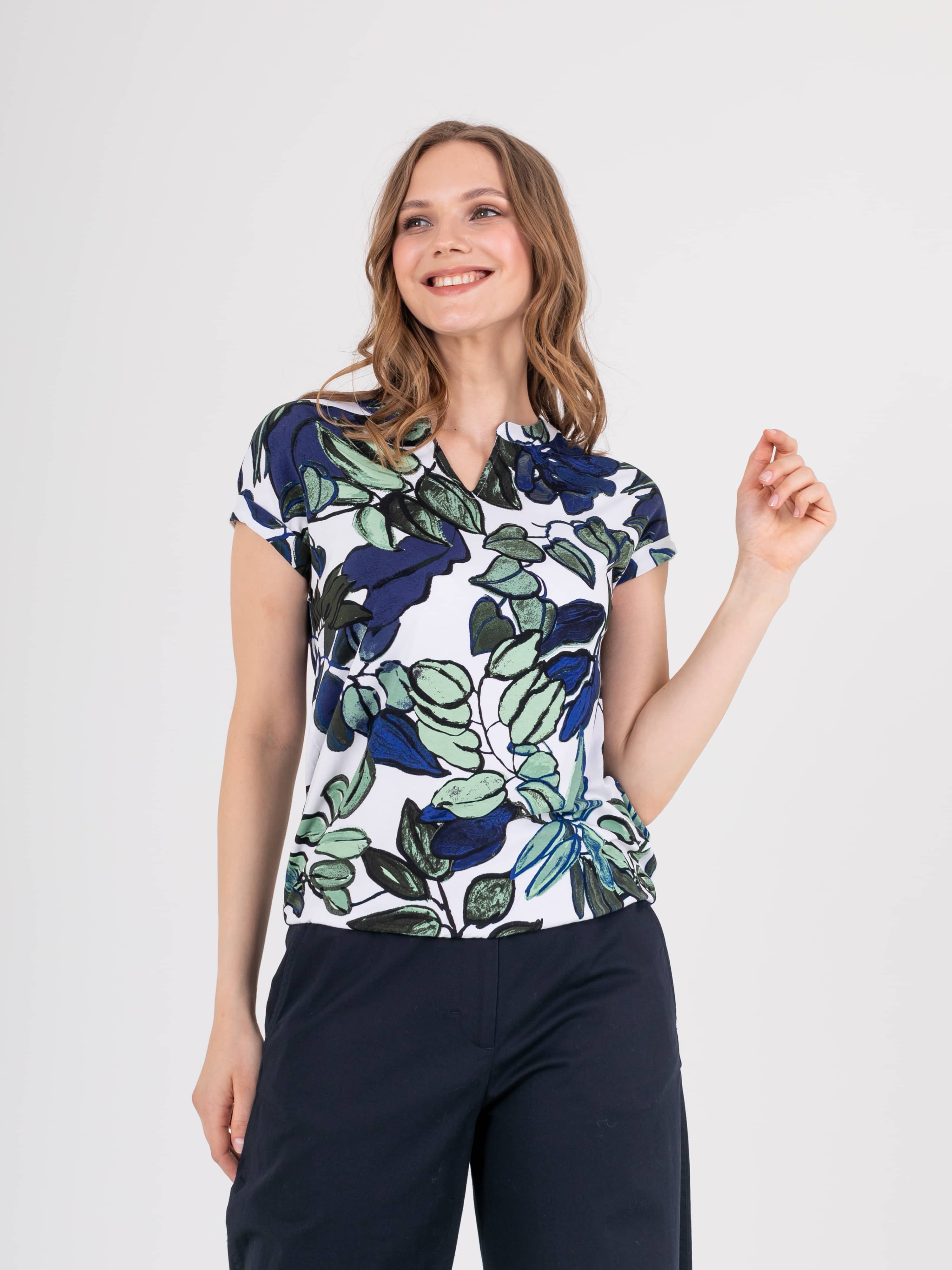 Футболка средней длины прямого силуэта из легкой, мягкой вискозы с добавлением эластана, дизайнерская особенность модели – эффектный растительный принт. Короткие цельнокроеные рукава с манжетами. Круглый вырез горловины с разрезом, обработан косой бейкой.