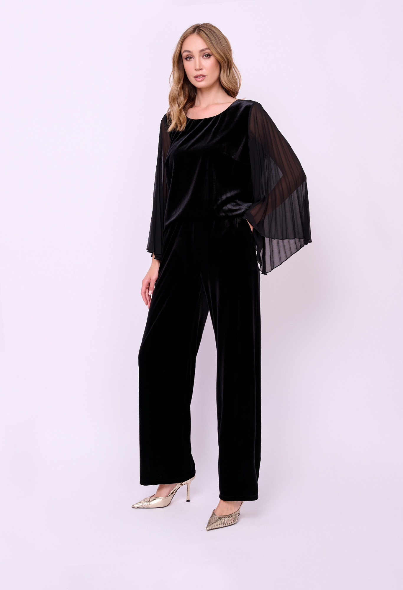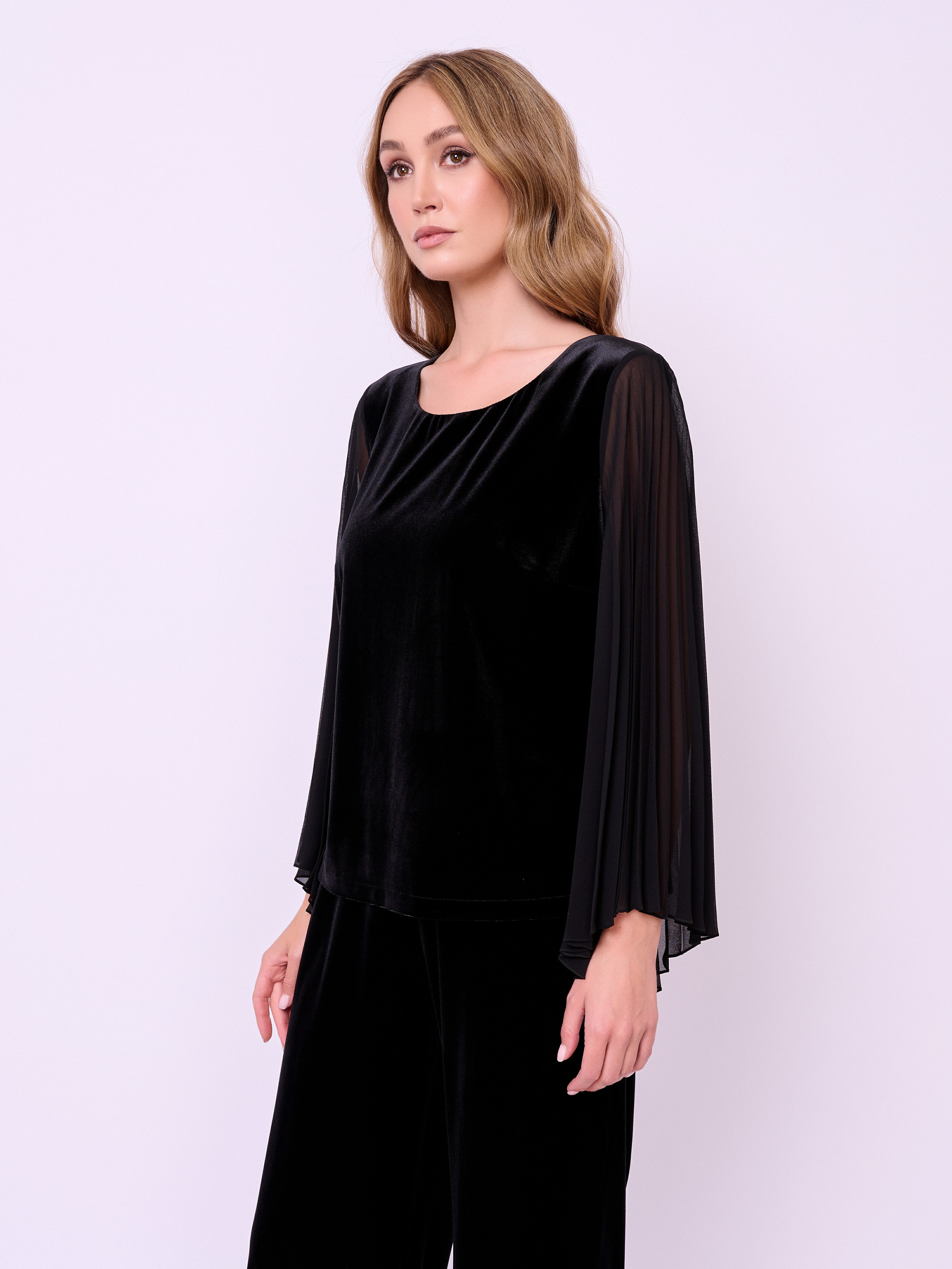 Комбинированная блуза из бархатного трикотажа с плиссированными рукавами асимметричного кроя из шифона, округлой горловиной и боковыми разрезами. Длина по спинке: 56 см.