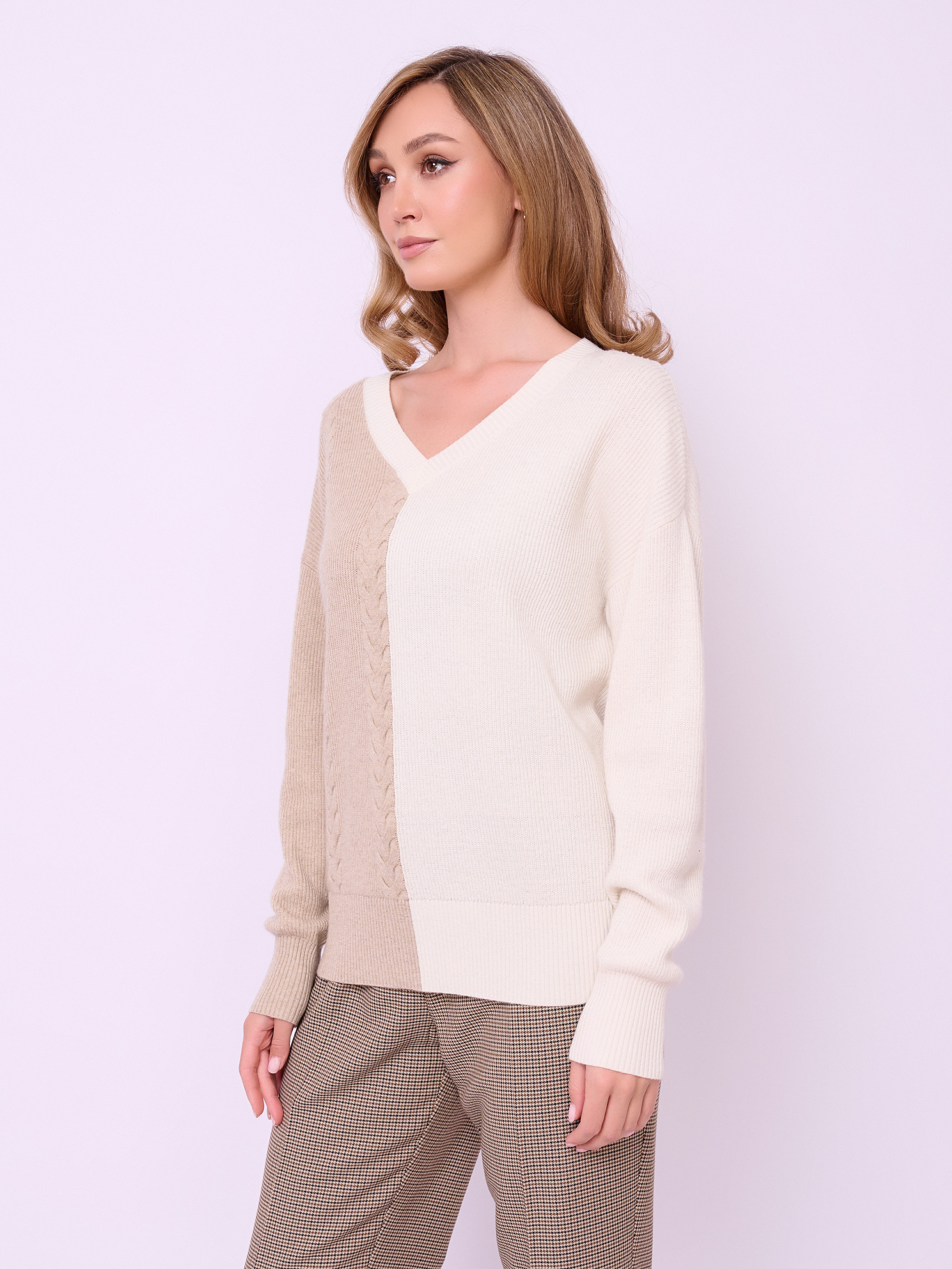 Пуловер прямого покроя в стиле «колор блок» из смесовой шерсти и кашемира с V-образным вырезом горловины, длинными рукавами-реглан и рисунком «косы». Длина по спине: 63 см.