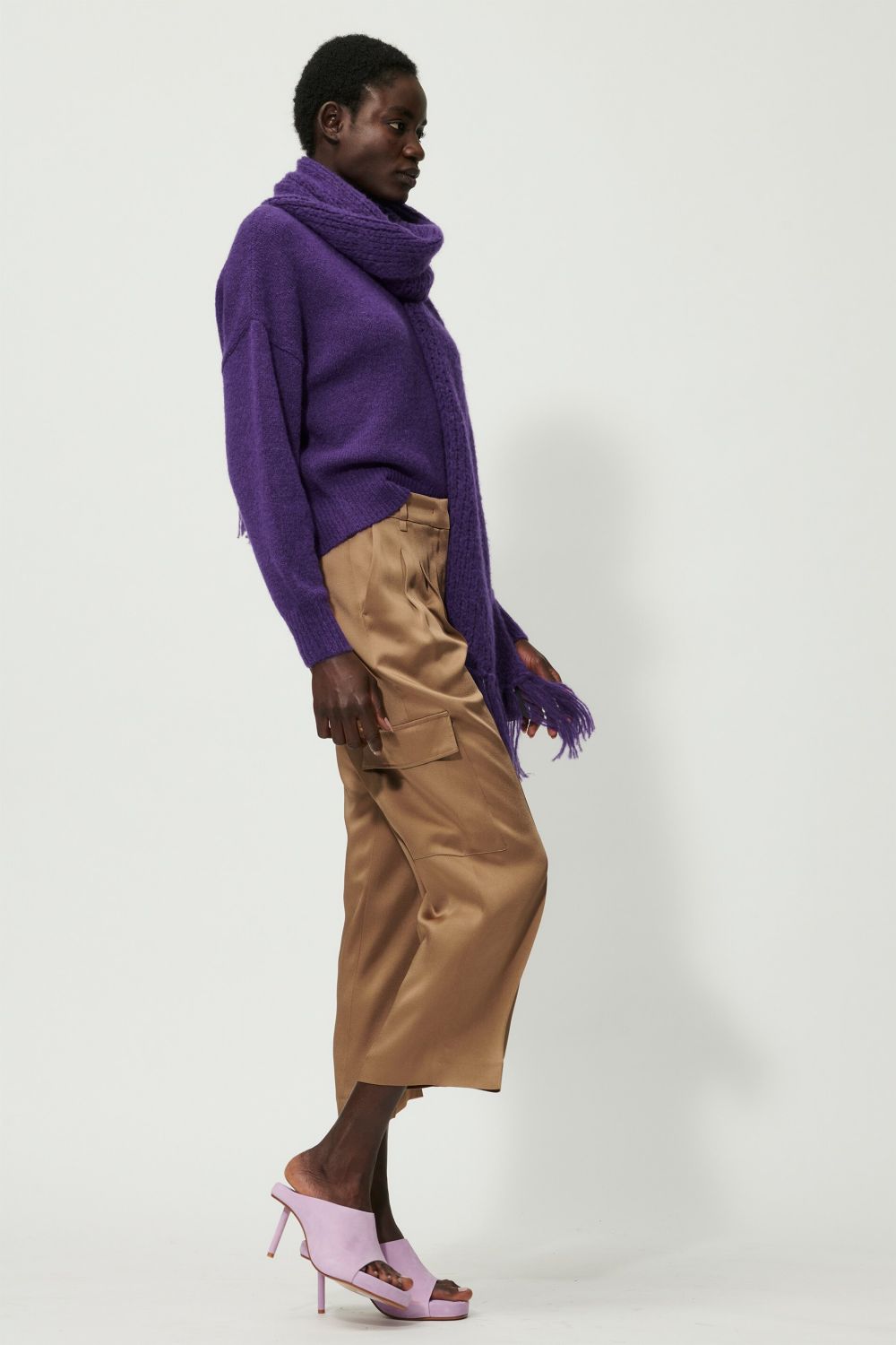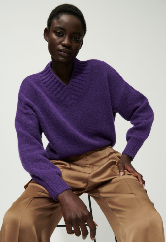 Легкий пуловер с V-образным вырезом из высококачественной итальянской полушерстяной ткани. Заниженные плечи помогают создать повседневный образ.