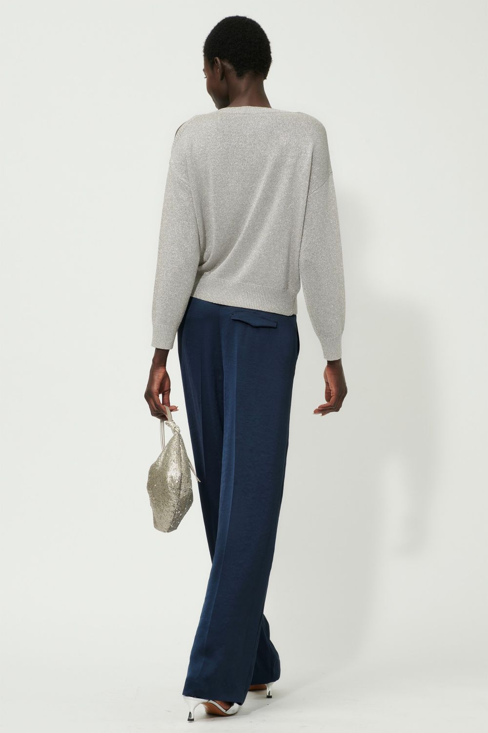 Повседневный свитер с приспущенными плечами и изысканным вырезом. Металлизированная переливающаяся ленточная пряжа придает этому свитеру гламурный вид.