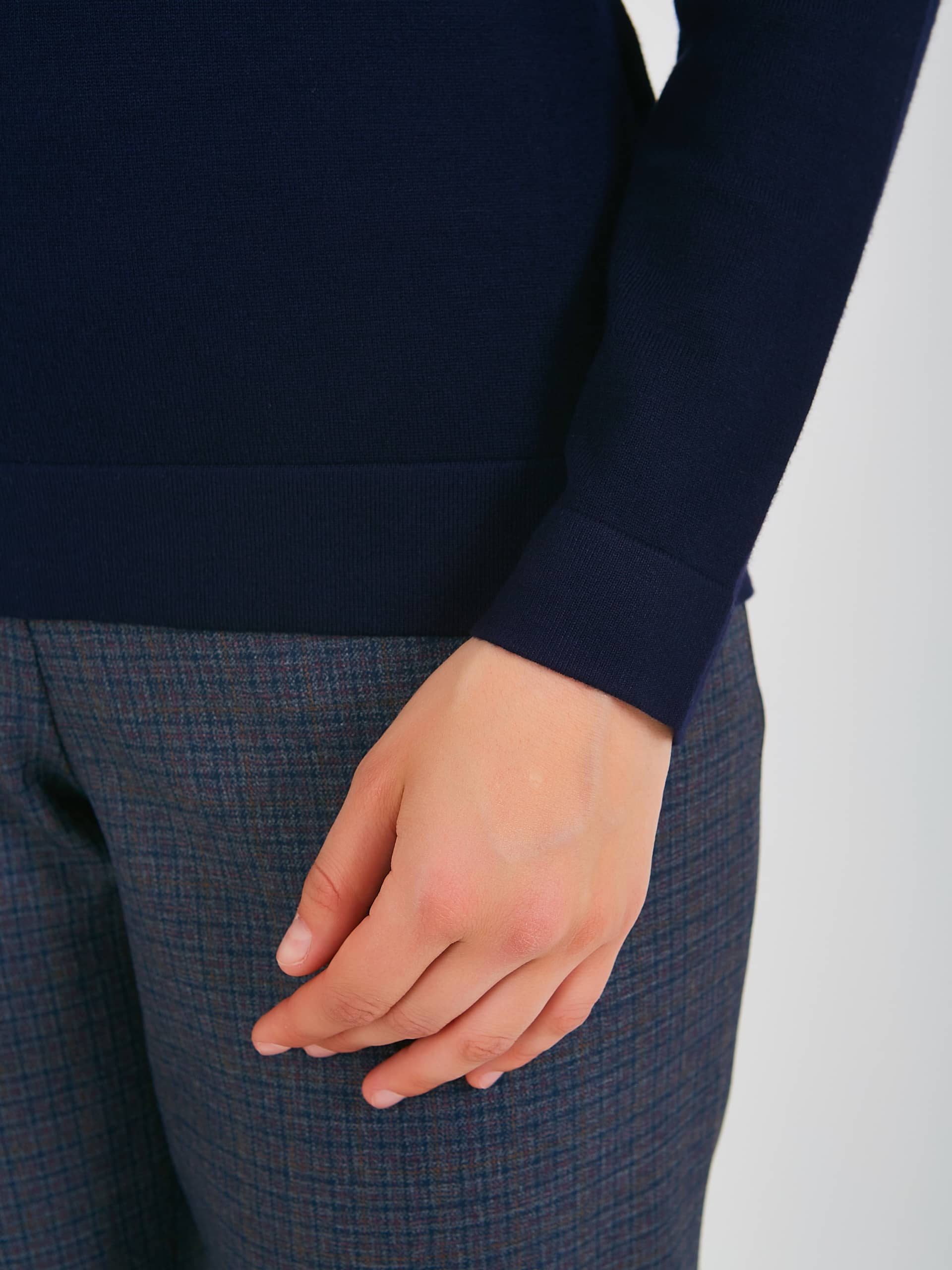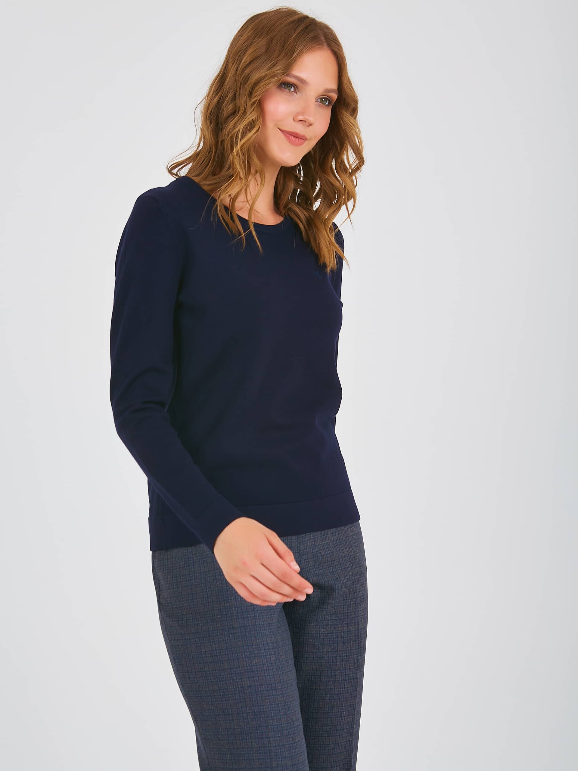 Джемпер средней длины полуприлегающего силуэта из мягкой вискозы с добавлением нейлона, дизайнерская особенность модели – небольшие нашивки по переду и спинке. Перед и спинка по низу обработаны манжетой. Длинные втачные рукава с манжетами. Круглый вырез горловины.