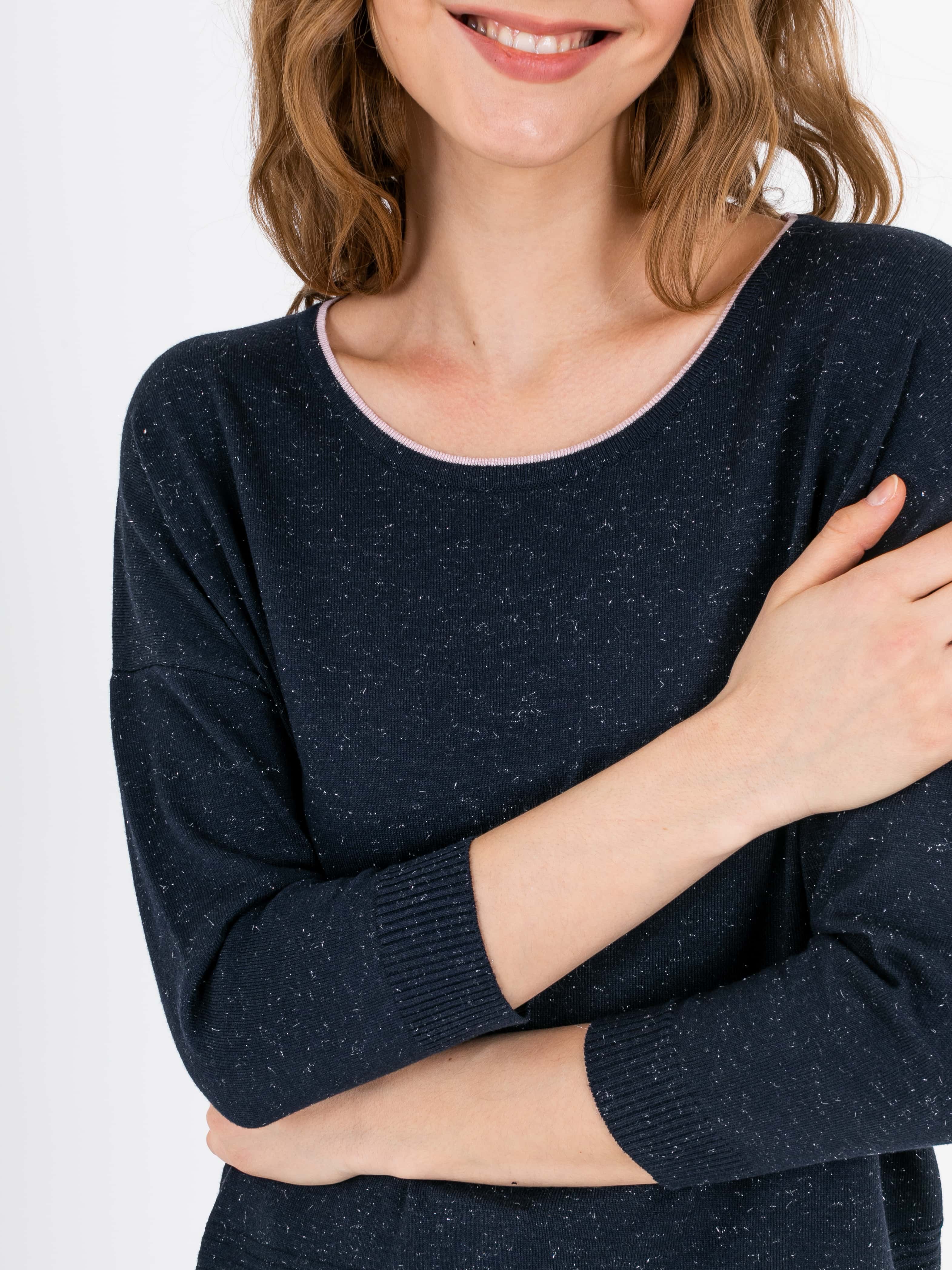 Джемпер прямого силуэта средней длины из мягкой вискозы с добавлением эластана и люрекса. Перед и спинка по низу обработаны манжетой. Перед выполнен из фактурного трикотажа. По спинке расположен нежный рисунок в виде звезды. Рукава втачные ¾ со спущенной линией плеча и манжетами. Круглый вырез горловины.