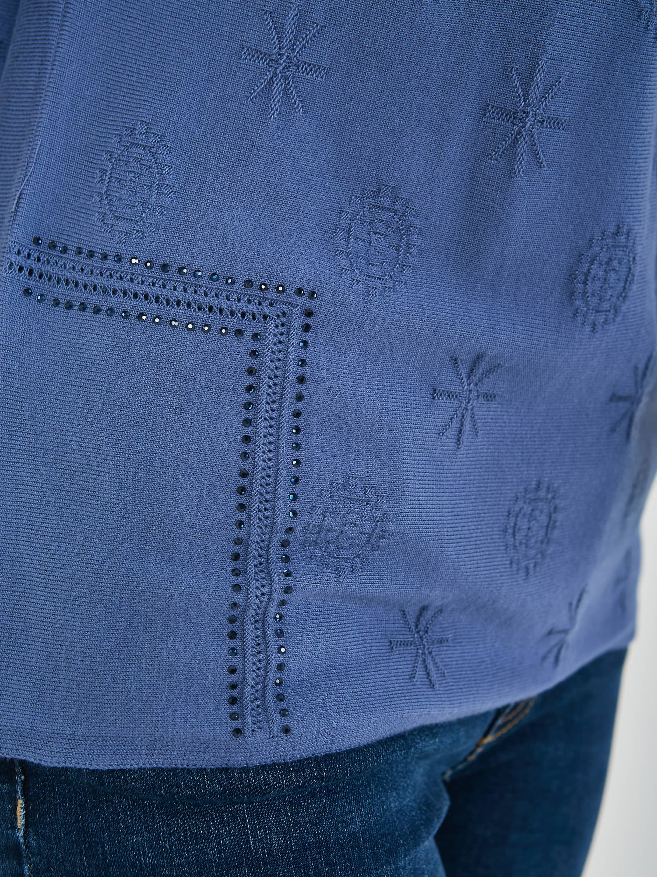 Джемпер средней длины прямого силуэта из мягкой вискозы с добавлением эластана, дизайнерская особенность модели – ажурный трикотаж с имитацией карманов и стразами. Цельнокроеные рукава до локтя. Круглый вырез горловины.