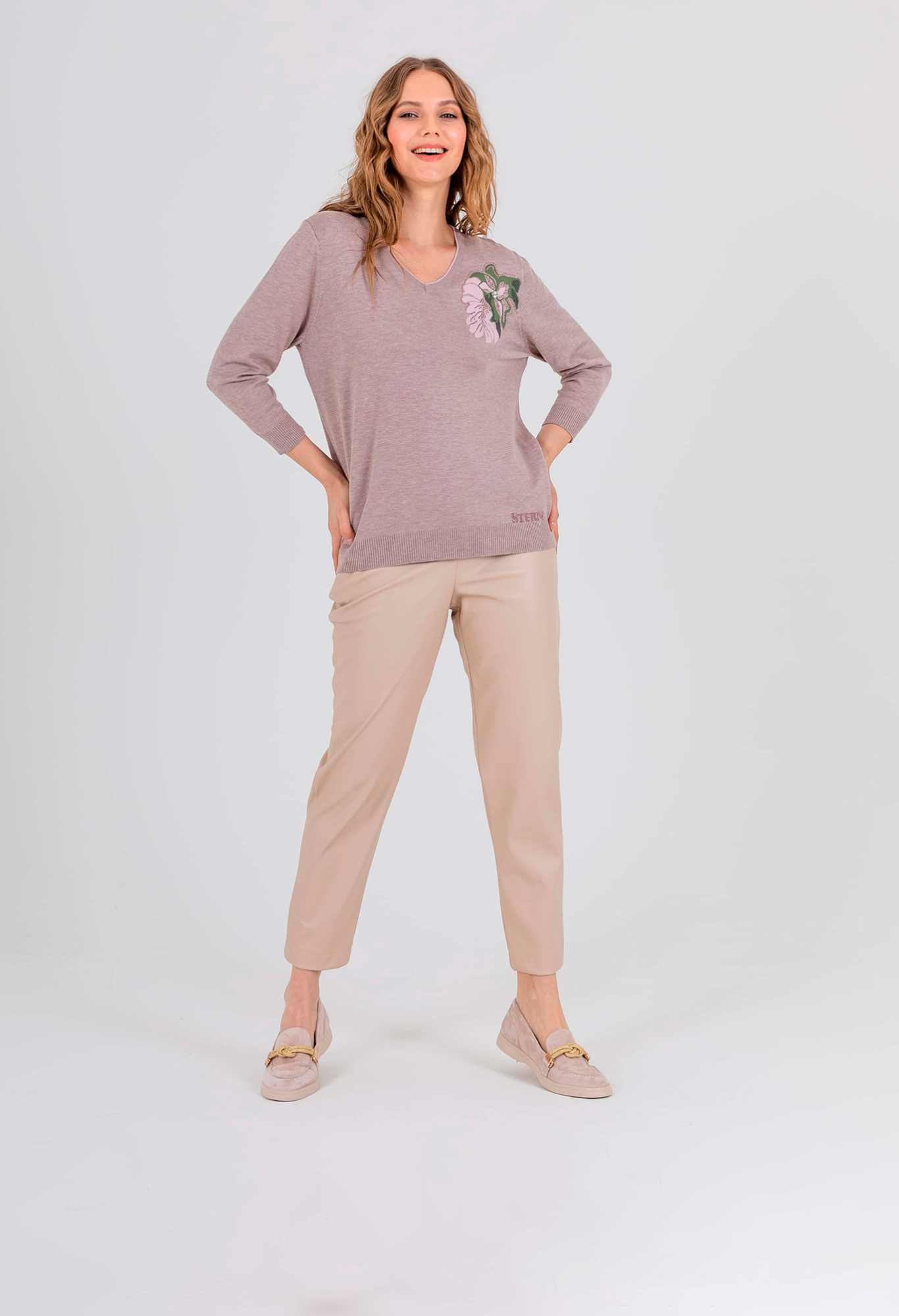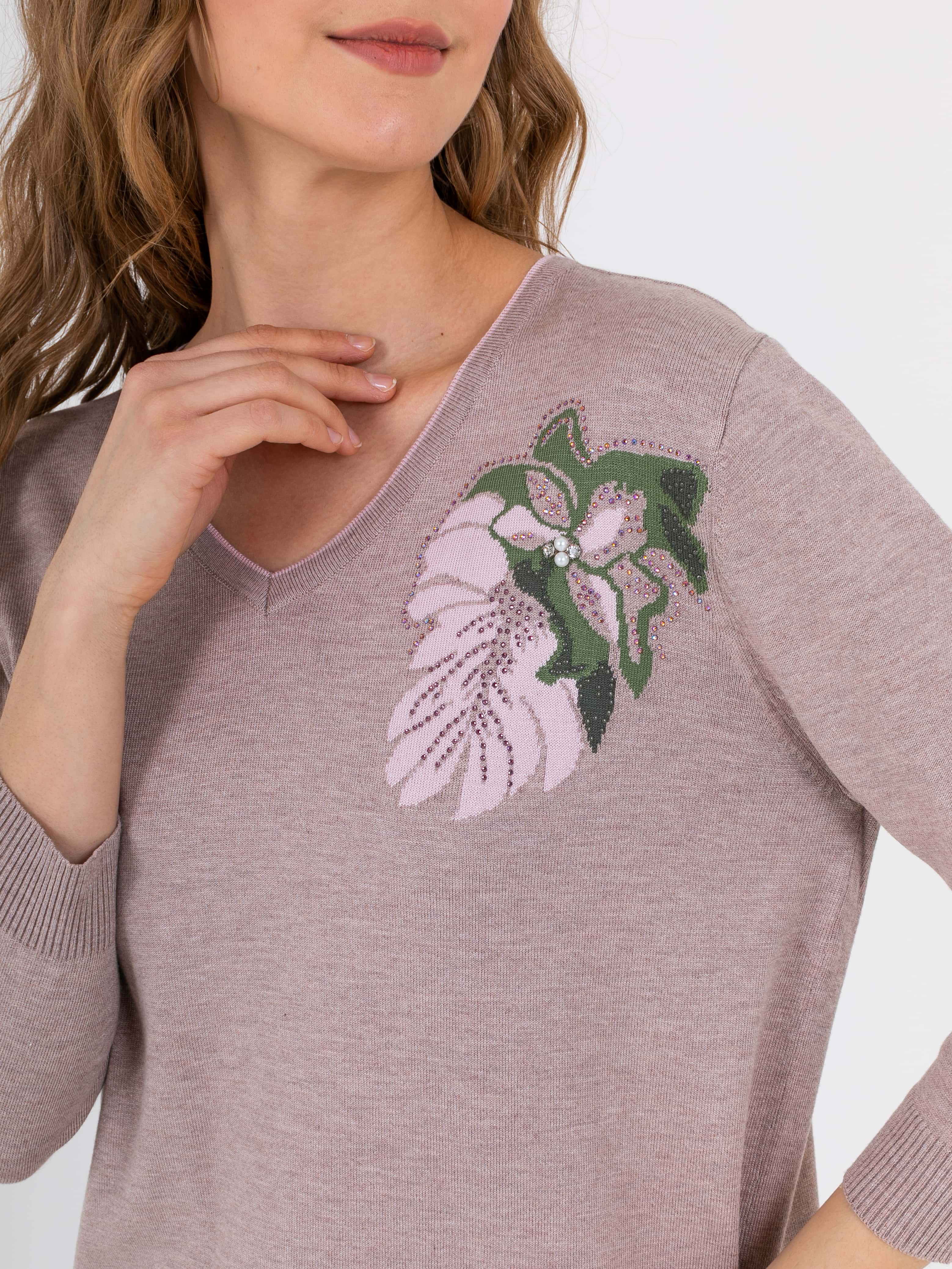 Джемпер средней длины прямого силуэта из мягкой вискозы с добавлением эластана. Перед и спинка по низу обработаны манжетой. По переду выполнен нежный тропический рисунок со стразами. Удлиненные втачные рукава со спущенной линией плеча и манжетами. V–образный вырез горловины.