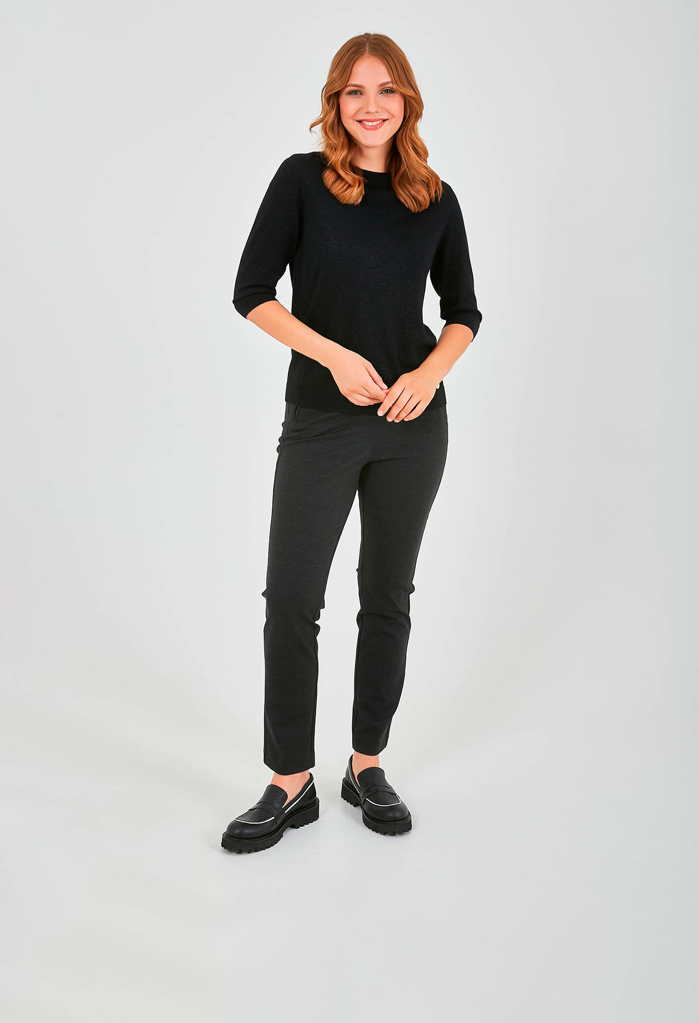 Джемпер средней длины прямого силуэта из мягкой шерсти с добавлением нейлона и люрекса. Перед и спинка по низу обработаны манжетой. Втачные рукава 3/4 с манжетами. Круглый вырез горловины.