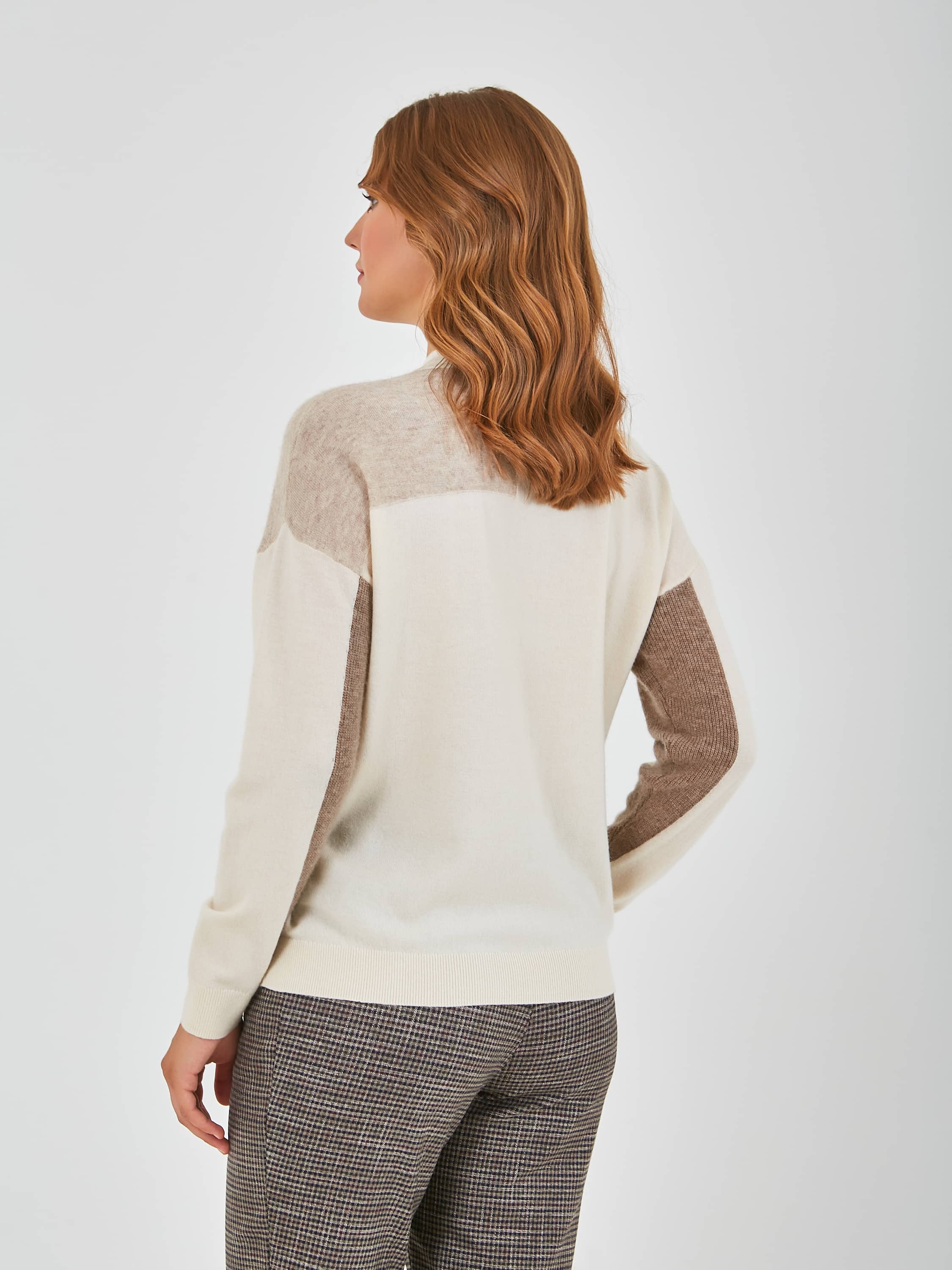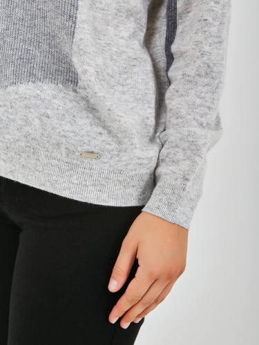 Джемпер средней длины прямого силуэта из мягкой шерсти с добавлением полиэстера и нейлона, дизайнерская особенность модели – геометрический рисунок и перфорированный трикотаж. Перед и спинка по низу обработаны манжетой. Длинные втачные рукава со спущенной линией плеча и манжетами. Воротник стойка.