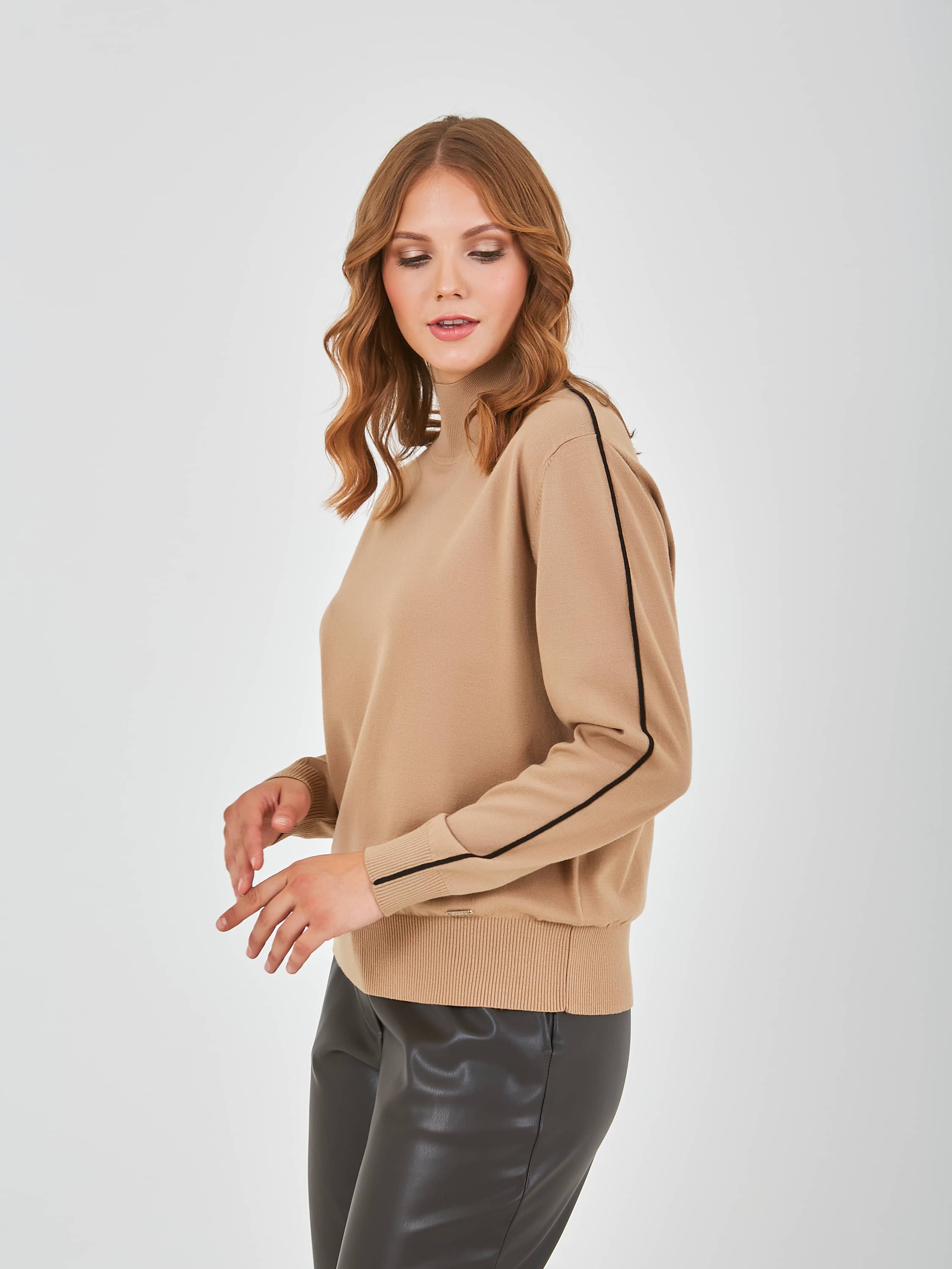 Джемпер средней длины прямого силуэта из легкого хлопка с добавлением вискозы, акрила и полиэстера, дизайнерская особенность модели - контрастный кант по всей длине рукава. Перед и спинка по низу обработаны манжетой. Длинные втачные рукава с манжетами. Воротник «хомут».