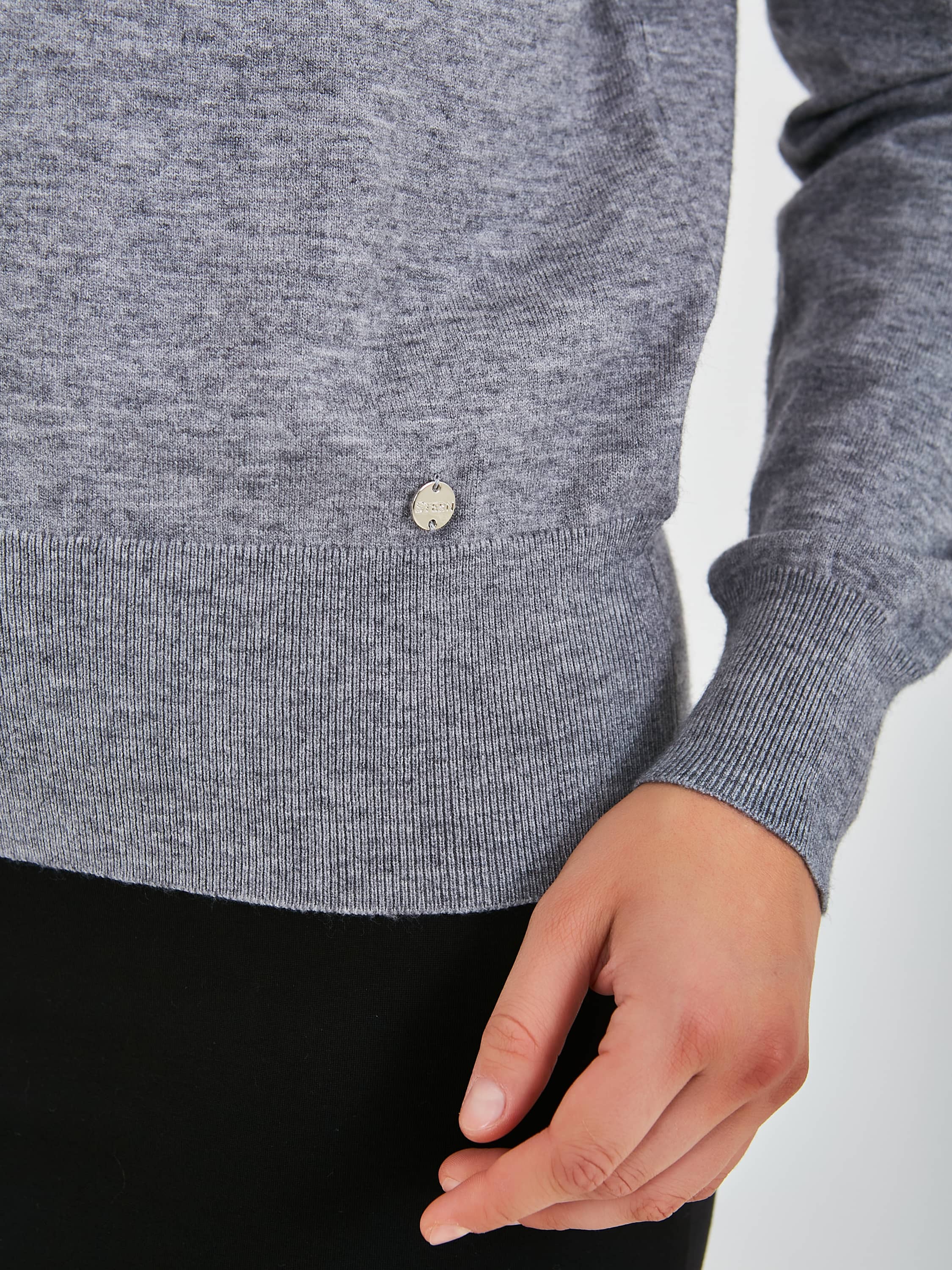Джемпер средней длины прямого силуэта из мягкой вискозы с добавлением полиэстера и нейлона. Перед и спинка по низу обработаны манжетой. Длинные втачные рукава с манжетами. Круглый вырез горловины.