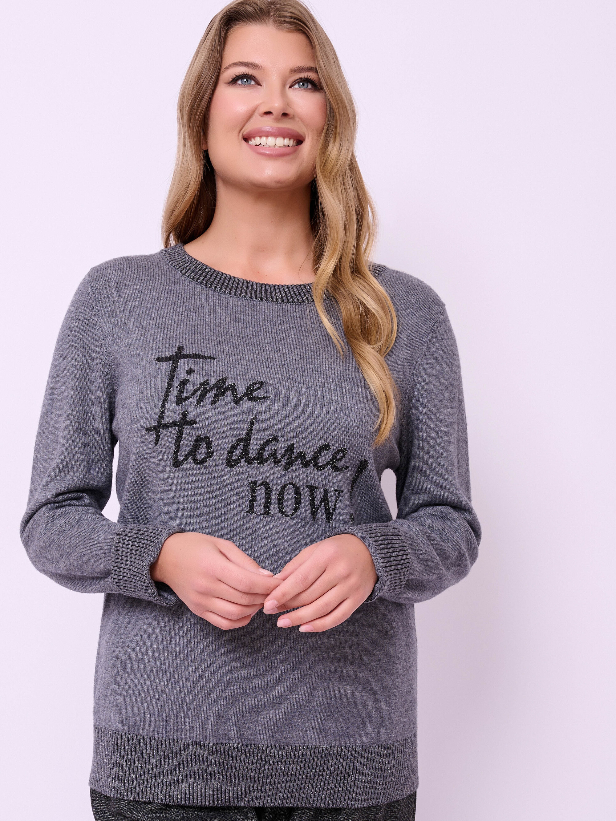 Джемпер трикотажный из смесовой шерсти прямого покроя с округлой горловиной, длинными рукавами и надписью из люрекса на груди. Длина по спинке: 66 см