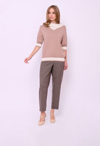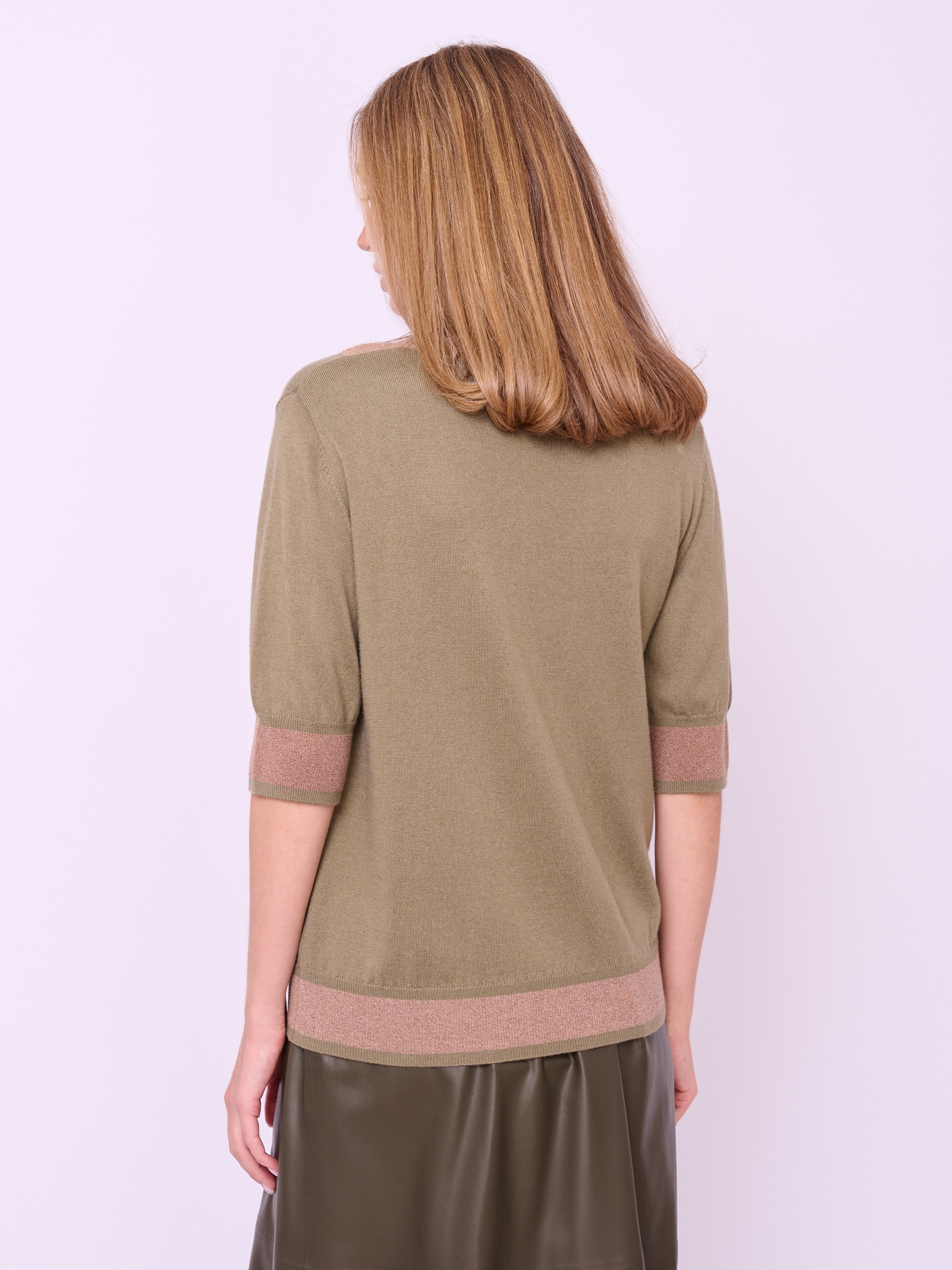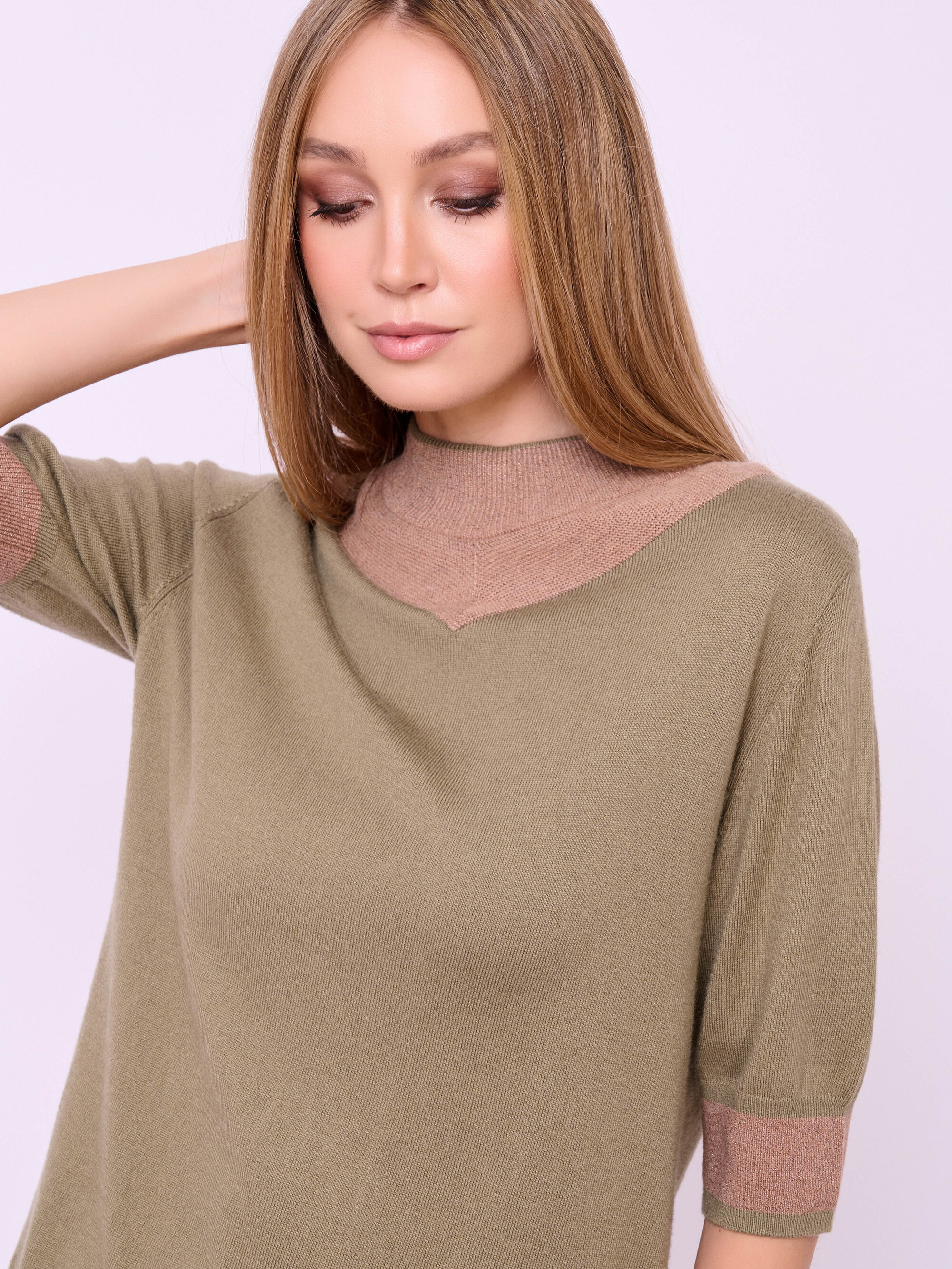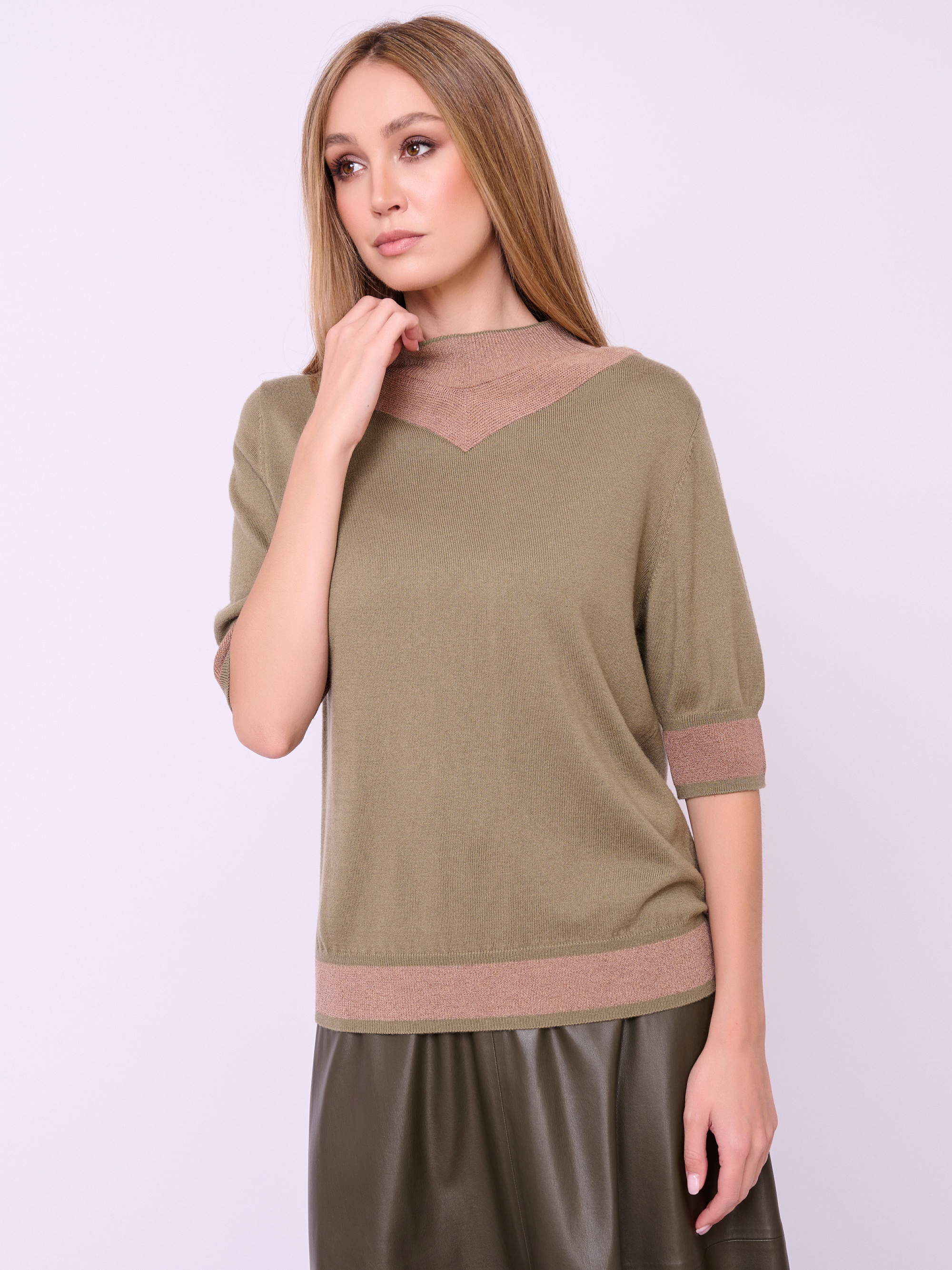 Трикотажный джемпер с воротником-стойкой, рукавами 1/2 и деталями из люрекса. Длина по спинке: 67 см