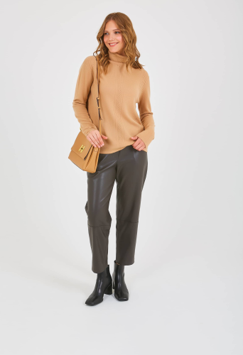 Джемпер средней длины прямого силуэта из мягкой шерсти, дизайнерская особенность модели – узорная вязка по переду. Длинные втачные рукава со спущенной линией плеча. Цельнокроеная стойка. Осень-Зима'25/26. Капсула "Хозяйка медной горы"