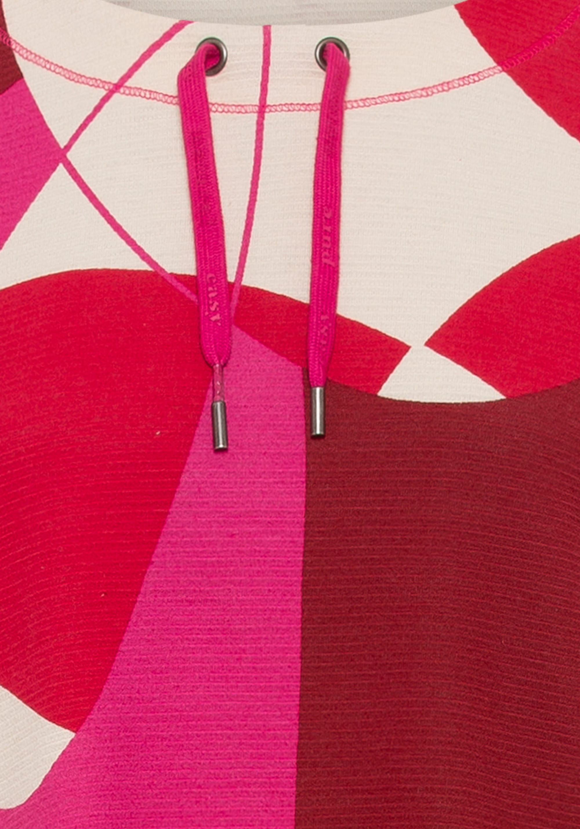 Трикотажный джемпер из джерси в рубчик украшен геометрическим узором по всей поверхности, напоминающим 70-е годы в ярких тонах. Детали включают небольшие боковые разрезы и завязки на закругленном вырезе. Модель Henny имеет прямой крой и слегка прилегает к телу.