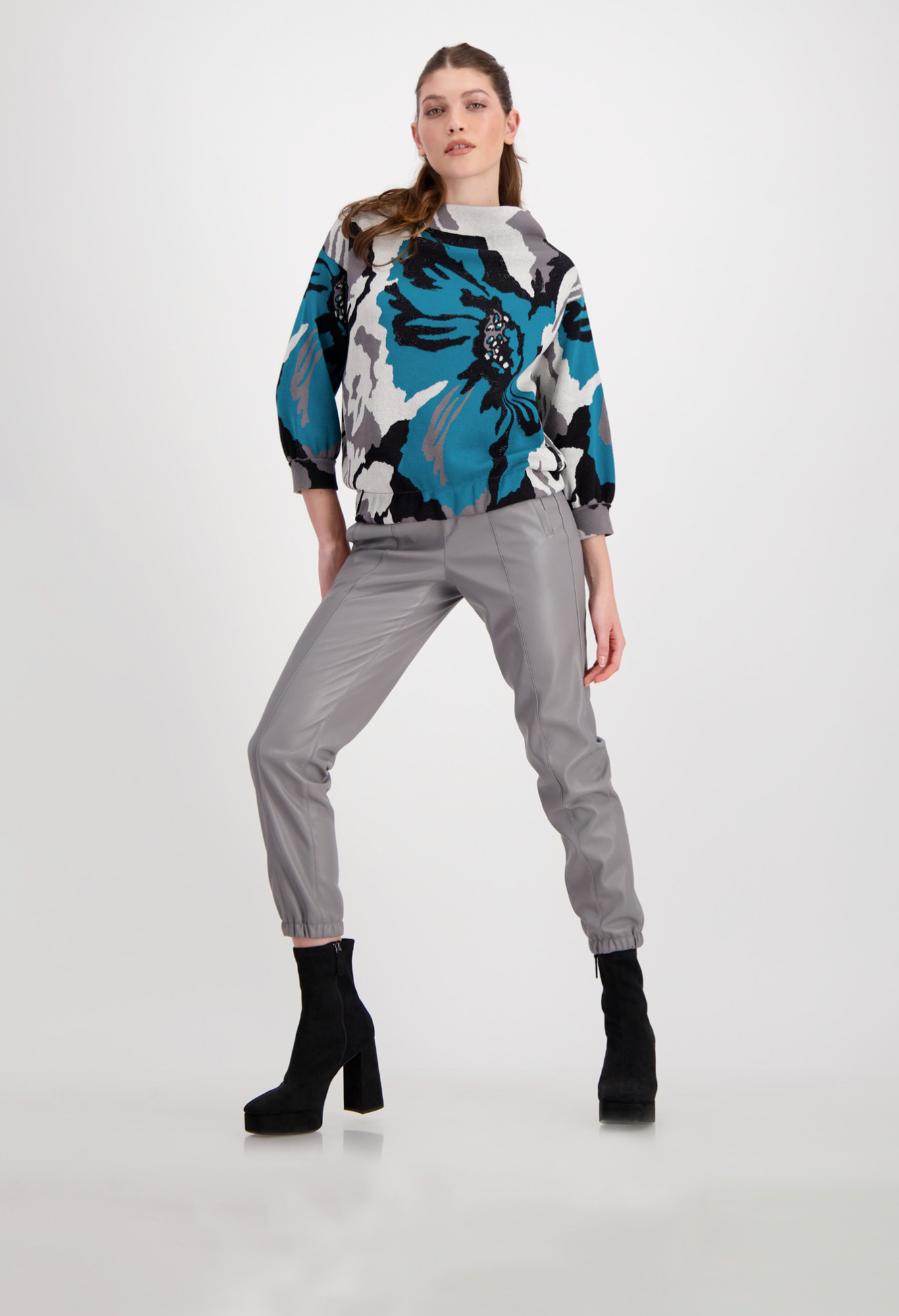 Удобный хлопковый свитер впечатляет красивой жаккардовой тканью с цветочным узором. Цветочный узор украшен сверкающими стразами. Регулярная посадка. Воротник-стойка, рукава 3/4, манжеты с рюшами.
