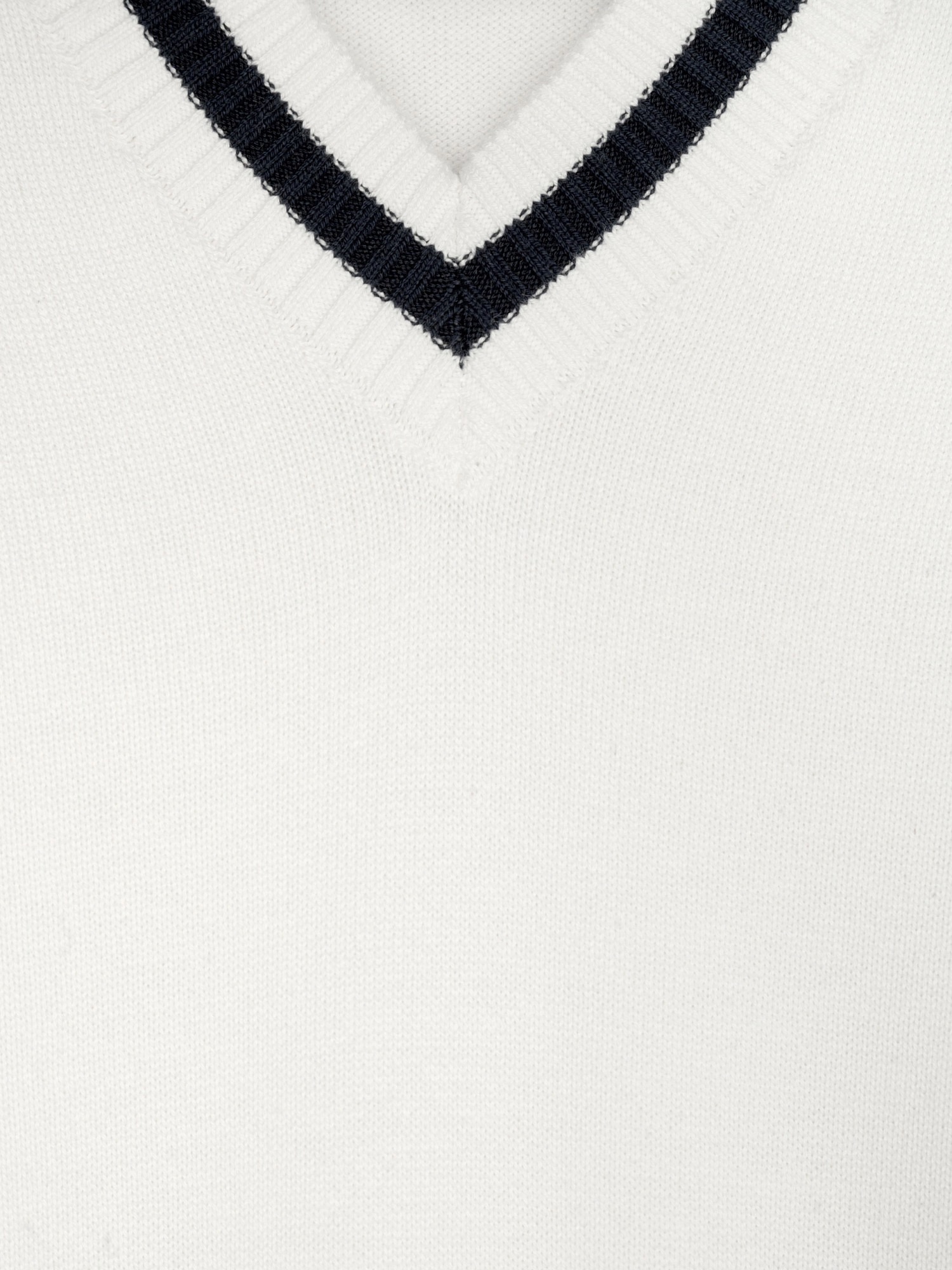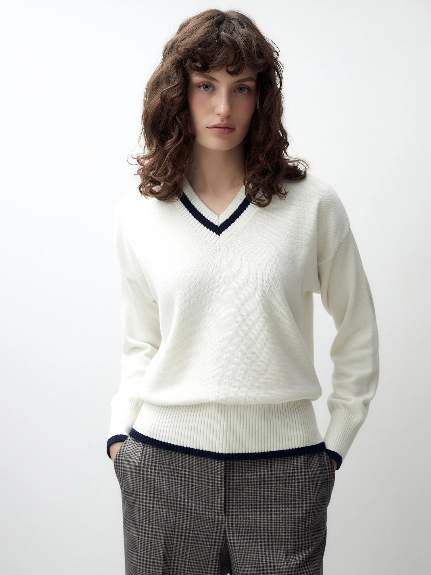 Джемпер с V-образной горловиной в нежно-белом оттенке из 100% хлопка, актуален в любое время года. Тонкая темно-синяя отделочная полоса придаст легкие морские нотки и будет выразительно смотреться с синими низами.