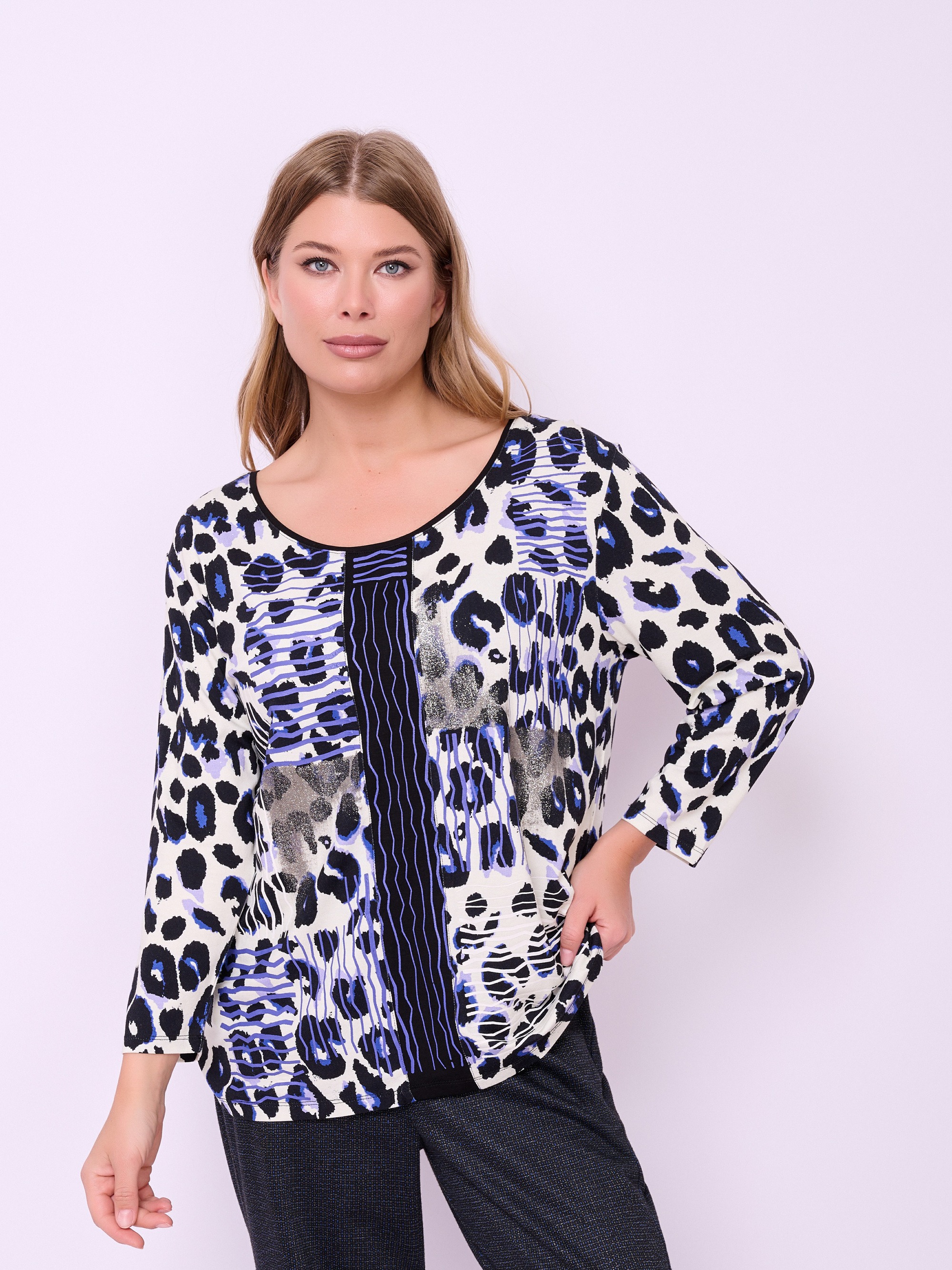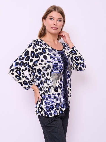 Джемпер трикотажный прямого покроя с глубоким округлым вырезом горловины, рукавами 7/8 и анималистическим рисунком. Длина по спинке: 64 см.