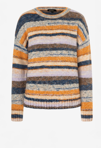 Пушистый, мягкий свитер с разноцветными полосками. Повседневный фасон со спущенными плечами, круглый вырез, длинный рукав. Ребристые манжеты на подоле и манжетах. Длина по размеру 42 - 58 см.