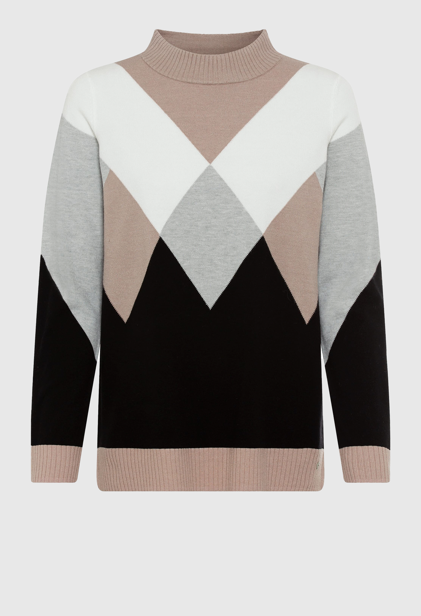 Нейтральные оттенки сочетаются в классическом ромбовидном узоре на этом бархатистом, мягком и тонком пуловере. Рельефная отделка окаймляет воротник, манжеты и подол. Модель имеет прямой крой и слегка прилегает к телу.